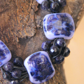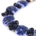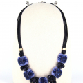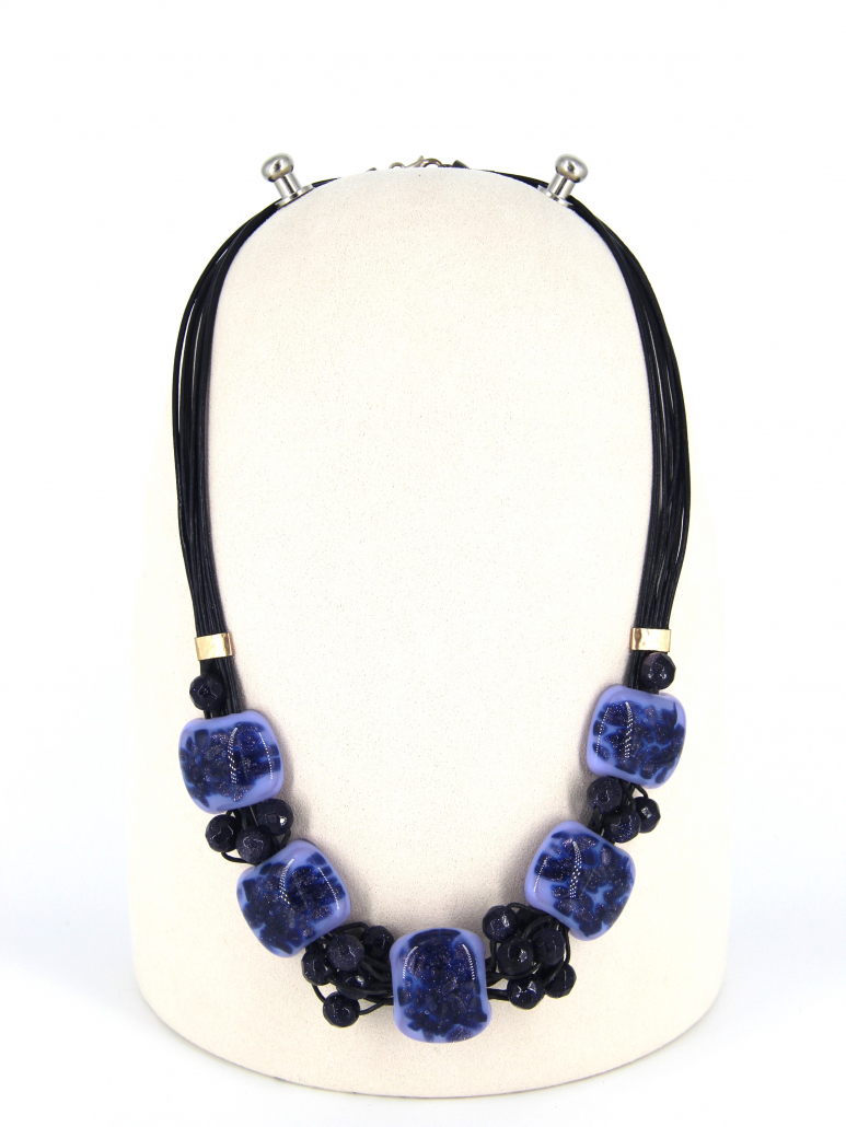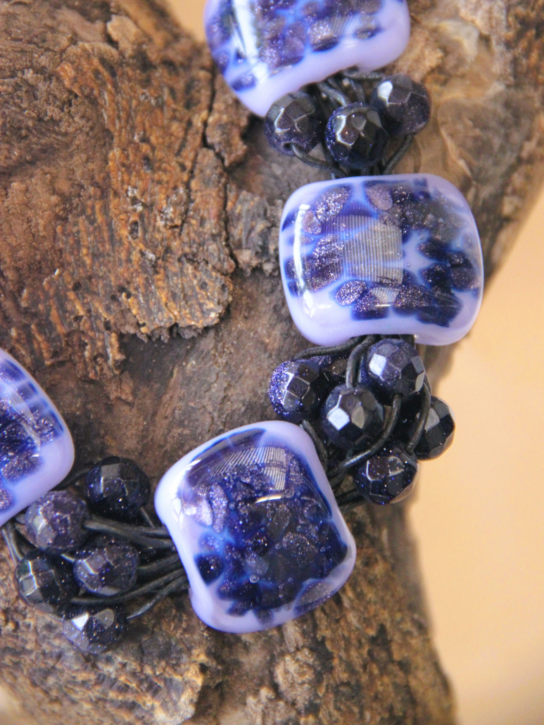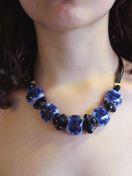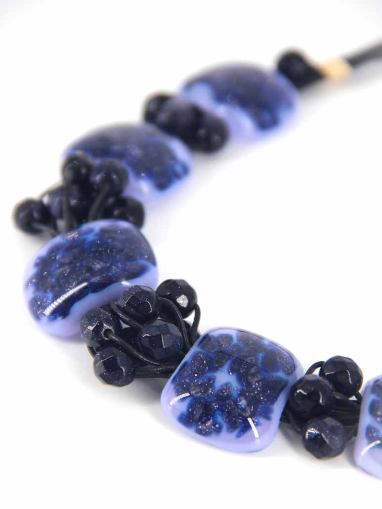 This exquisite handmade necklace is a stunning blend of fused glass, leather, gold-filled accents, and blue goldstone beads. Each fused glass piece is carefully crafted, featuring a mesmerizing swirl of deep blue and black hues, perfectly complemented by the shimmering blue goldstone beads. The gold-filled accents add a touch of elegance, while the durable leather ensures a comfortable fit. This unique piece is designed to be a statement accessory, perfect for adding a touch of sophistication to any outfit. Embrace the beauty of artisanal craftsmanship with this captivating necklace.