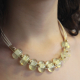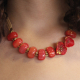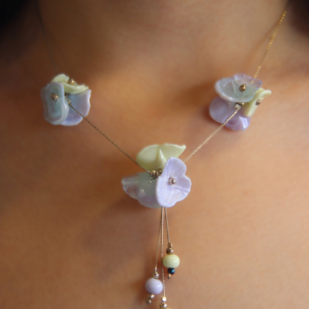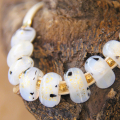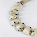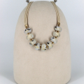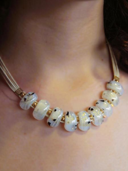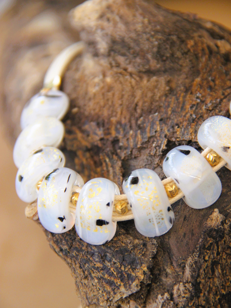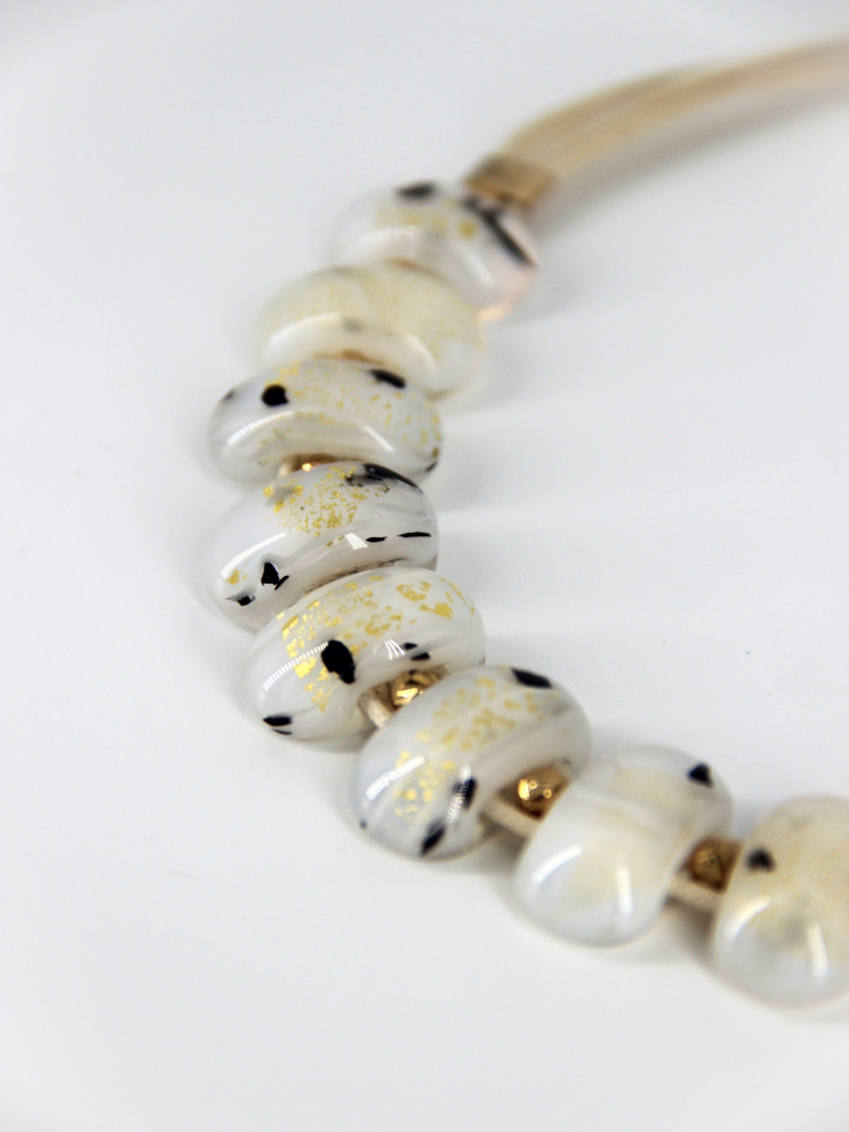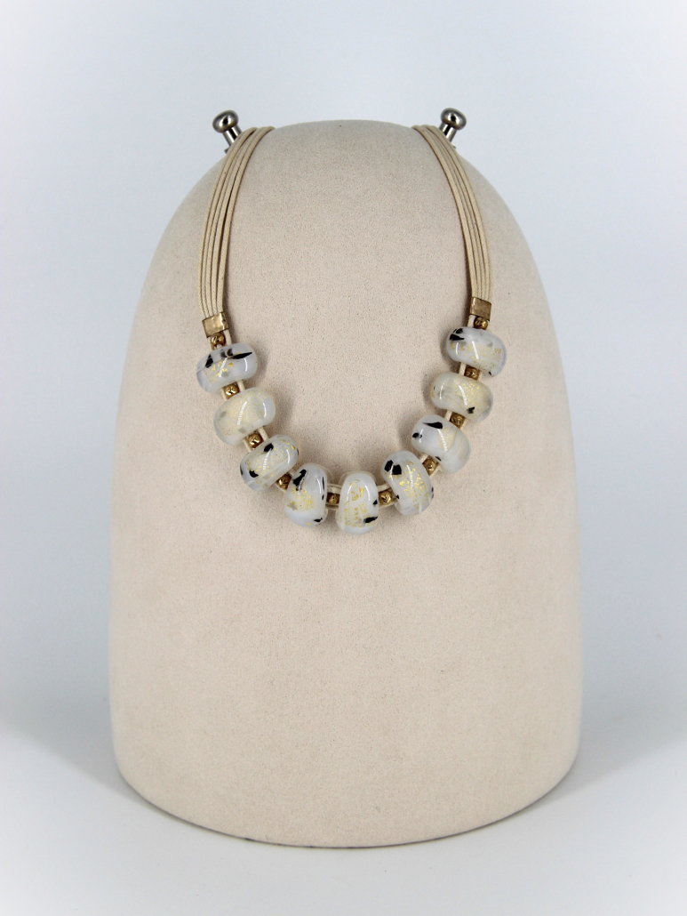 This stunning handmade necklace features a harmonious blend of cotton cords, gold-filled accents, and fused glass beads. The necklace is adorned with a series of striking fused glass beads, each showcasing a unique combination of white, black, and gold speckles that shimmer in the light. These captivating beads are intricately strung on soft, cream-colored cotton cords, creating a beautifully textured and elegant piece. The addition of luxurious gold-filled accents further enhances the necklace’s sophisticated appeal. This exquisite piece effortlessly combines artistic craftsmanship with contemporary elegance, making it a perfect accessory for any occasion.