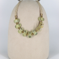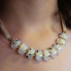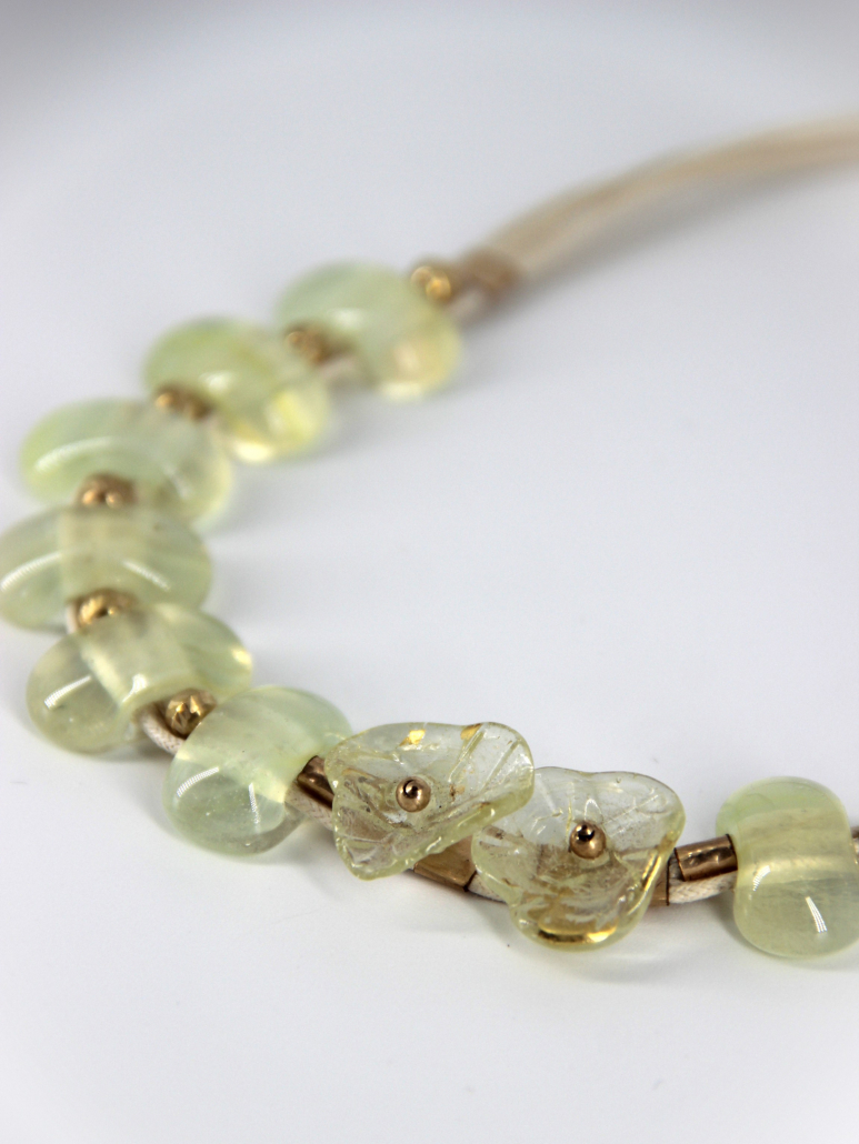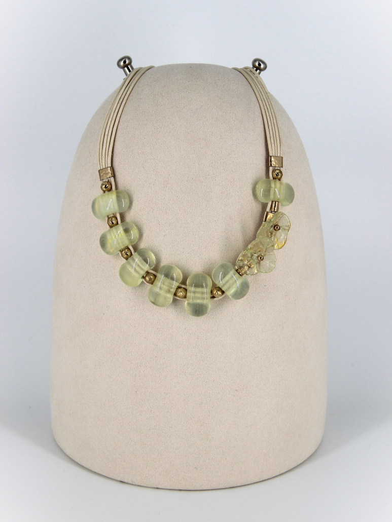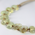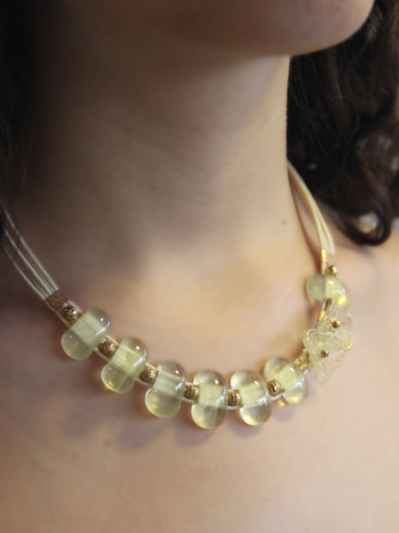 This exquisite handmade necklace features a captivating blend of cotton cords, gold-filled accents, fused glass, and lampwork glass flower beads. The necklace showcases a series of light yellow fused glass beads, each with a smooth, glossy finish that beautifully catches the light. These radiant beads are intricately woven with soft, cream-colored cotton cords, creating a textured and elegant pattern. Adding a touch of whimsical charm, the necklace is adorned with delicate lampwork glass flowers in a matching light yellow hue, each meticulously crafted to capture the essence of blooming flowers. Finished with luxurious gold-filled accents, this necklace is a perfect fusion of playful charm and refined elegance, making it a standout addition to any jewelry collection.