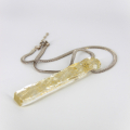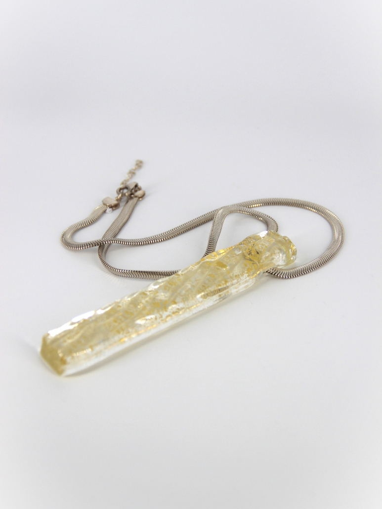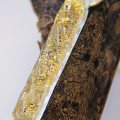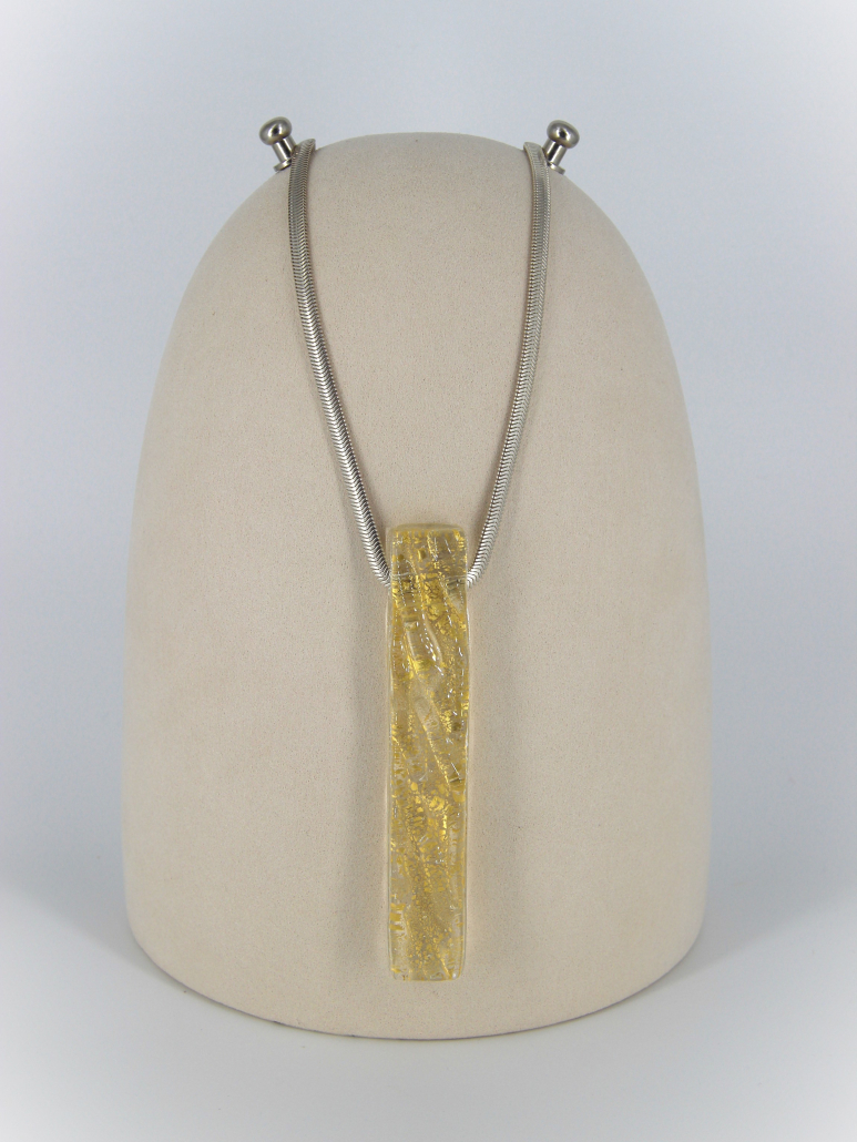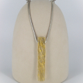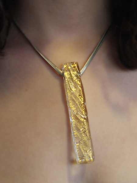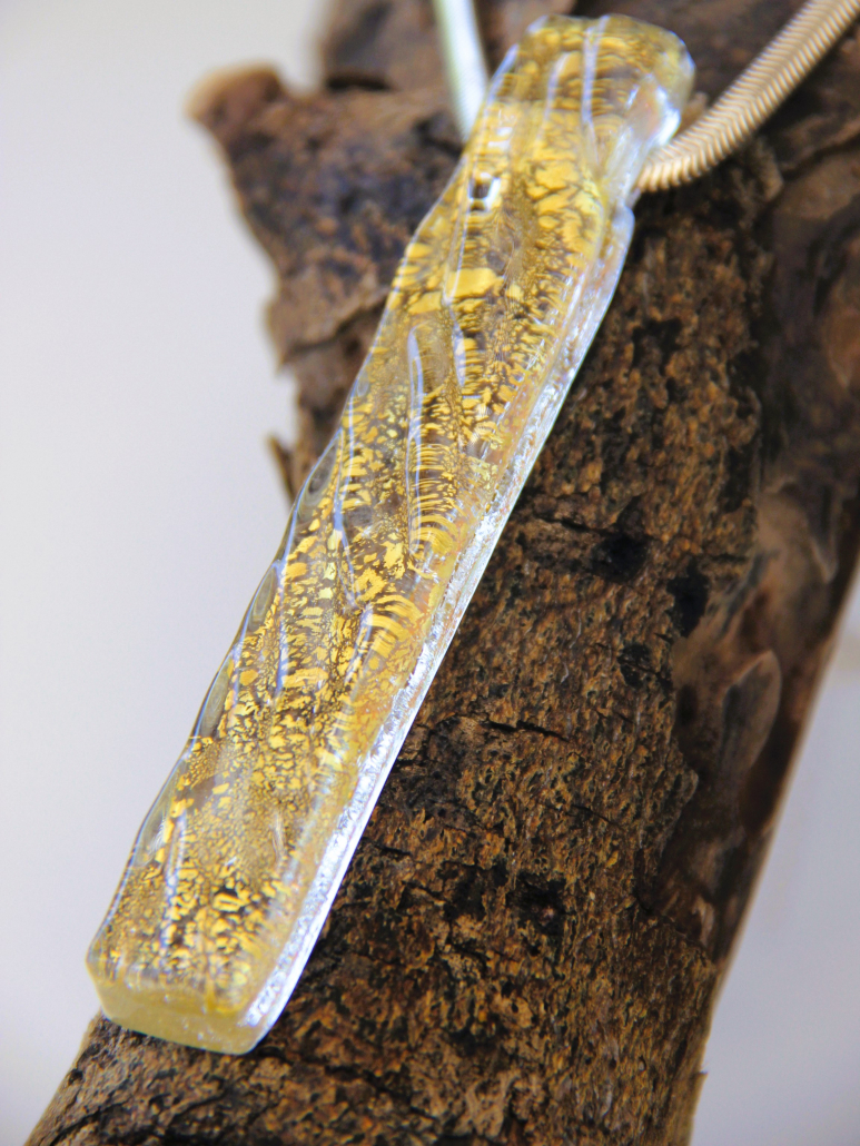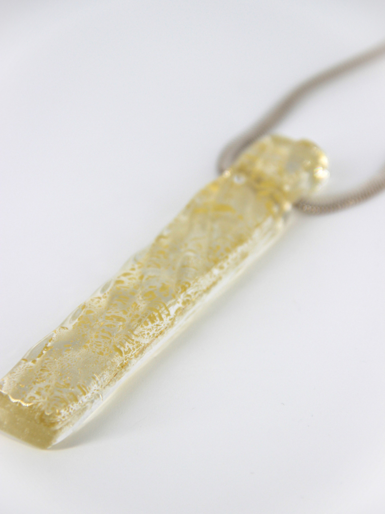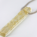 This luxurious handmade necklace features a stunning combination of 925 silver and fused glass, accented with a 25K gold leaf. The centerpiece of the necklace is a long, rectangular fused glass pendant that shimmers with the exquisite beauty of embedded 25K gold leaf, creating a mesmerizing effect as it catches the light. The pendant is elegantly suspended from a sleek 925 silver chain, adding a touch of sophistication and modernity to the design. The intricate patterns within the glass and the rich golden hues make this necklace a truly unique and eye-catching piece, perfect for adding a touch of opulence to any outfit.