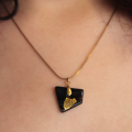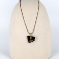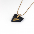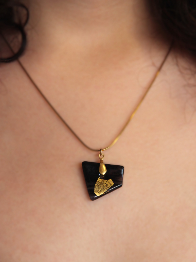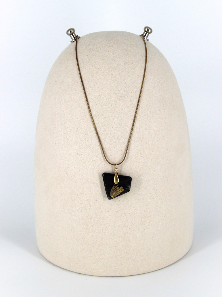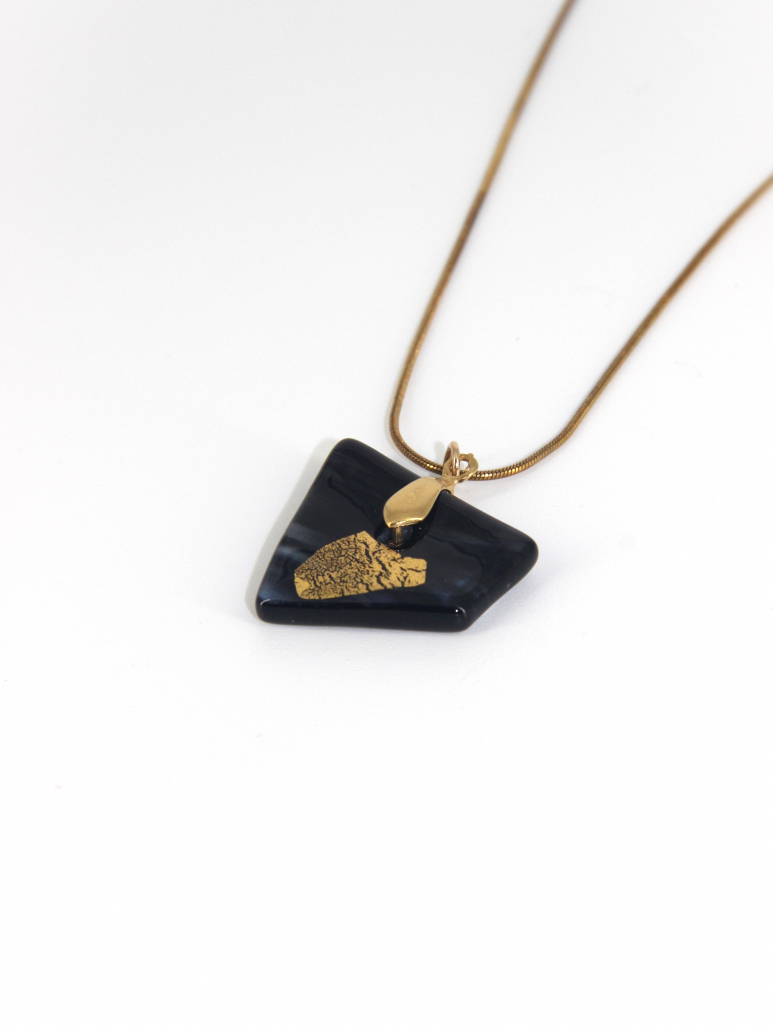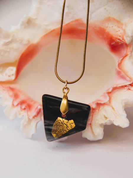 This exquisite handmade necklace features a sophisticated design crafted from gold-filled components and fused glass. The centerpiece of the necklace is a uniquely shaped fused glass pendant in a deep, rich black hue. The pendant is adorned with a delicate gold leaf accent, adding a touch of luxury and contrast to the design. The pendant is elegantly suspended from a sleek gold-filled chain, which enhances its modern and refined look. The combination of the glossy glass and the gold accents makes this necklace a perfect accessory for adding a touch of elegance and sophistication to any outfit.