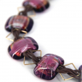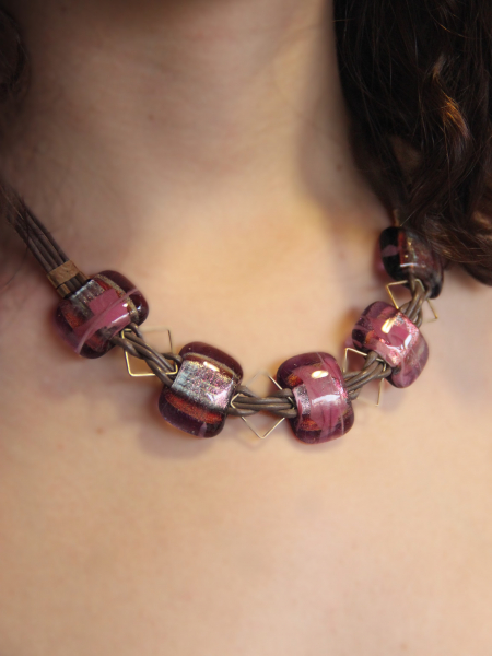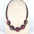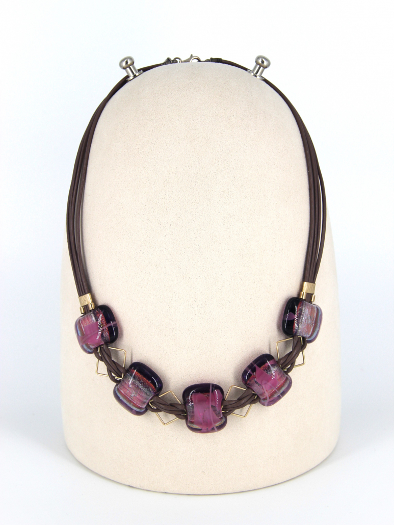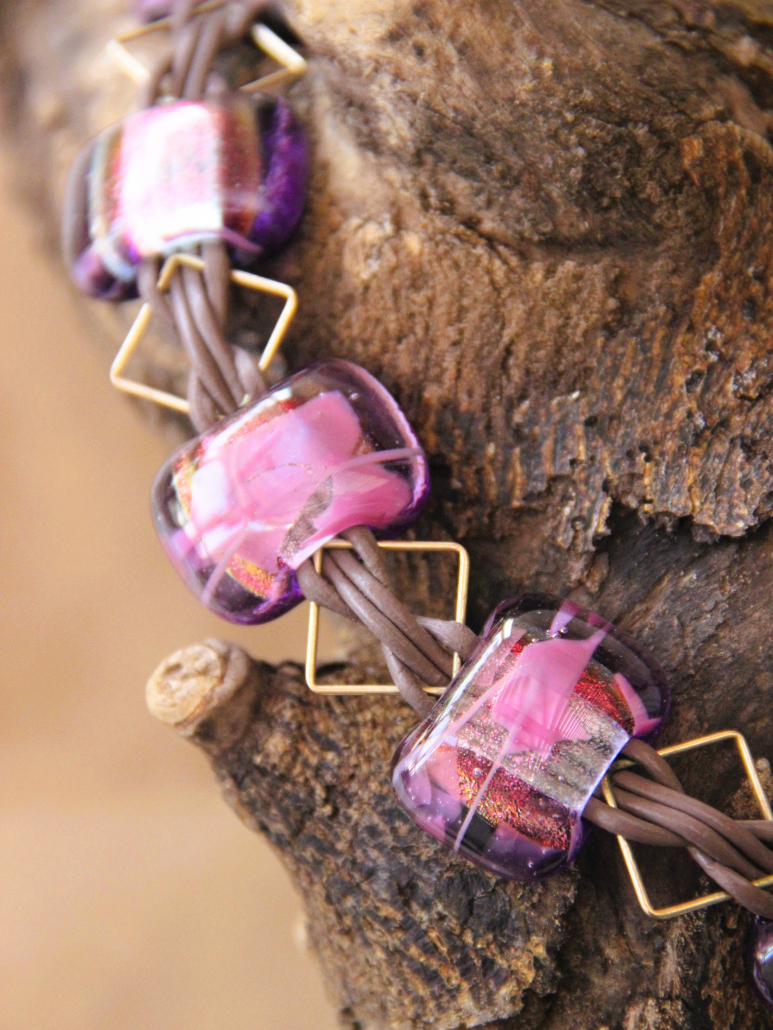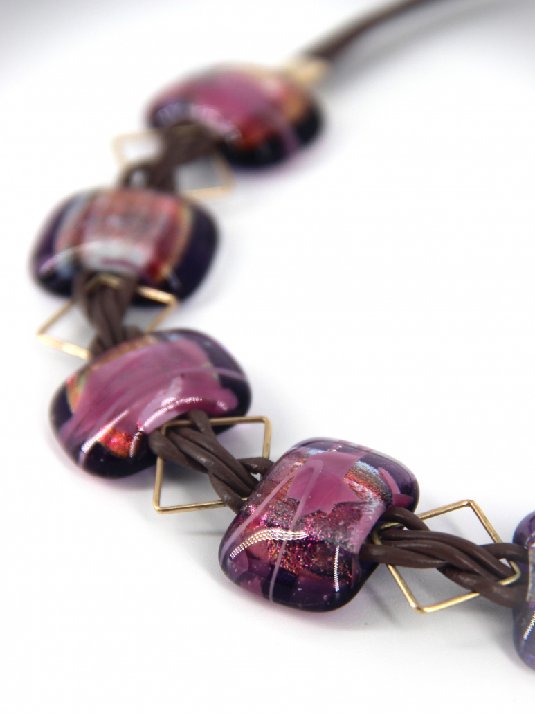 This stunning handmade necklace features a striking combination of leather, gold-filled accents, and vibrant fused glass beads. The bold and elegant design is perfect for making a statement, whether you’re dressing up for a special occasion or adding a touch of flair to your everyday look. The rich purple hues of the fused glass beads are complemented by the warm tones of the gold-filled components, creating a piece that is both eye-catching and timeless.