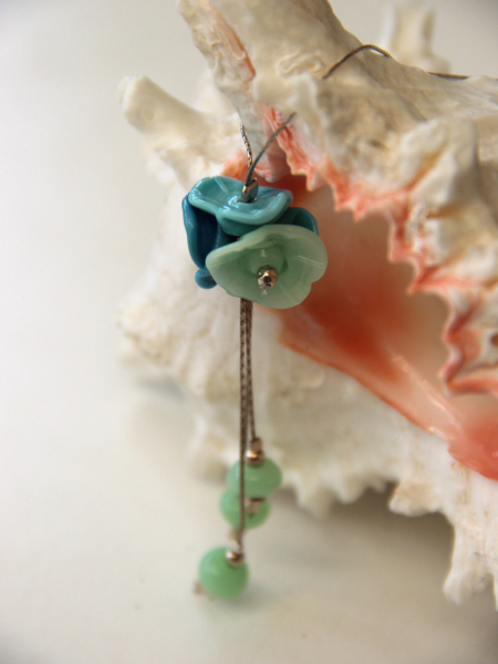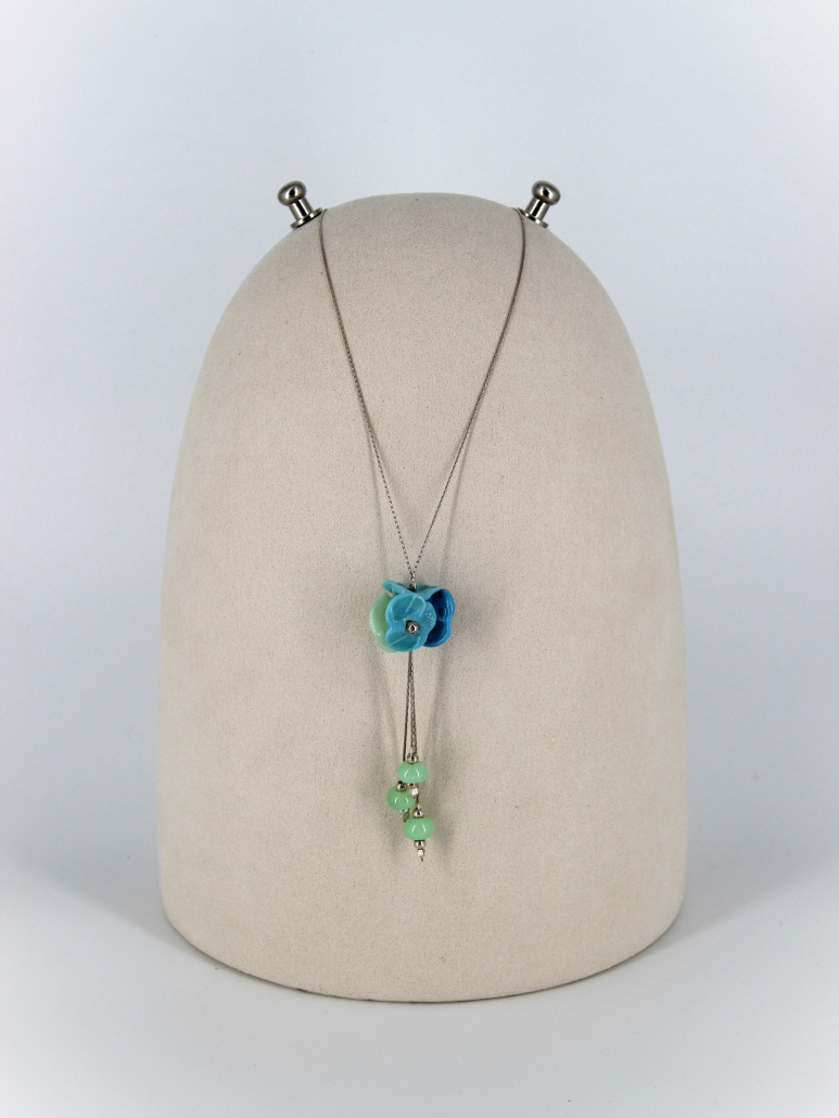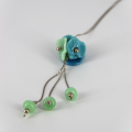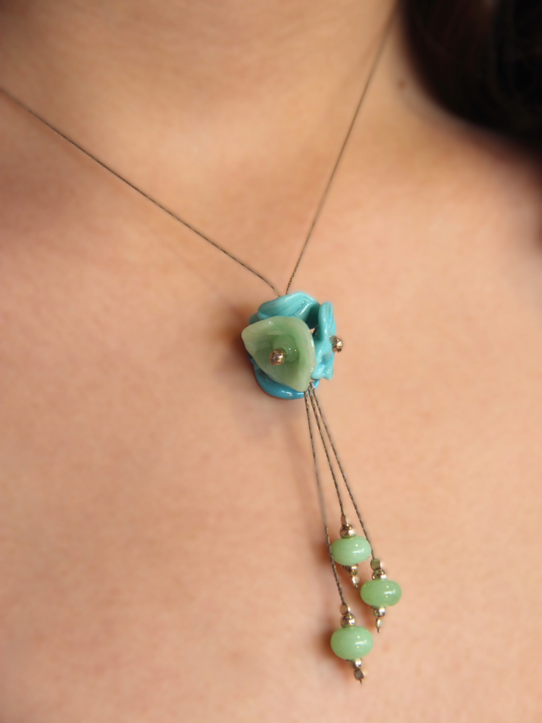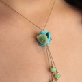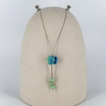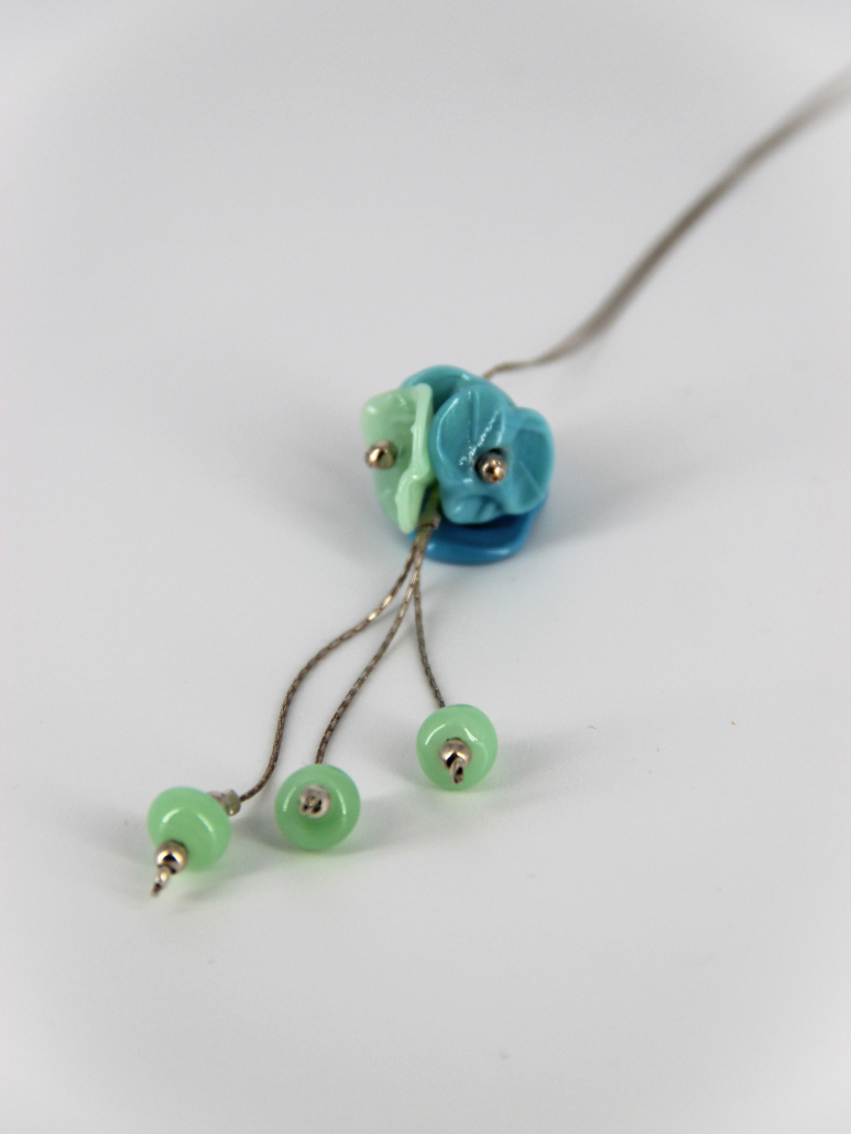 This enchanting handmade necklace features an elegant design crafted from 925 silver and adorned with delicate lampwork glass flower beads. The centerpiece of the necklace is a beautiful arrangement of turquoise and soft green glass flowers, each meticulously handcrafted and accented with tiny silver centers. Three slender silver chains extend gracefully from the floral cluster, each ending with a matching green glass bead and silver accents, adding a touch of movement and charm. The fine silver chain completes the design, offering a lightweight and comfortable fit. This necklace is perfect for adding a touch of floral elegance and sophistication to any outfit, making it a lovely addition to any jewelry collection.