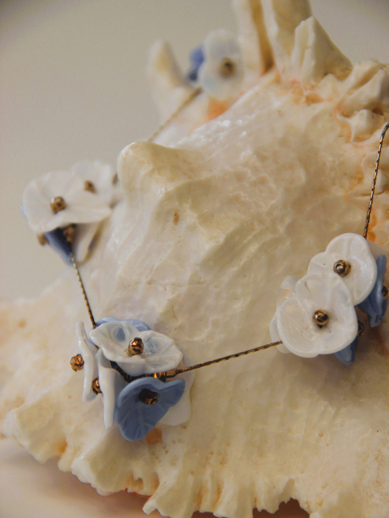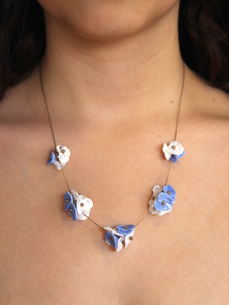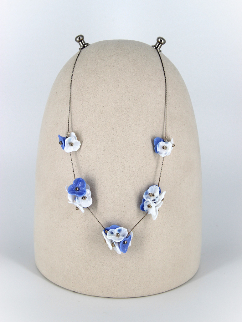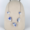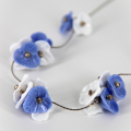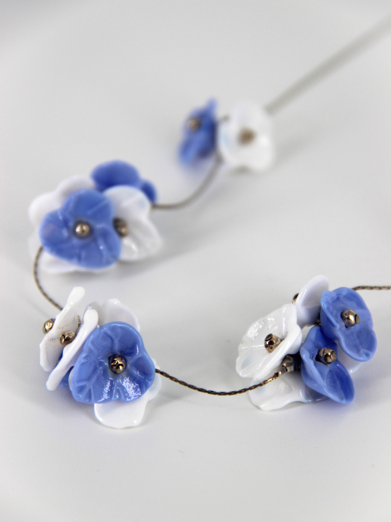 This charming handmade necklace features an elegant design crafted from 925 silver. The necklace is adorned with delicate lampwork glass flower beads, each meticulously handcrafted. The flowers come in soft shades of blue and white, creating a beautiful and harmonious color palette. Each flower bead is accented with tiny silver centers, adding a touch of sparkle and sophistication. The flowers are spaced evenly along the fine silver chain, creating a graceful and feminine look. This necklace is perfect for adding a touch of floral elegance to any outfit, making it a versatile and lovely addition to your jewelry collection.