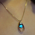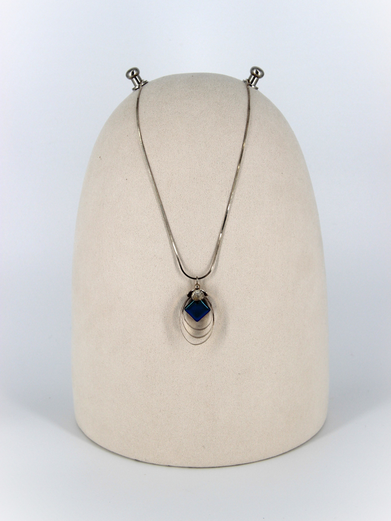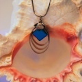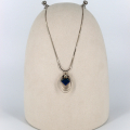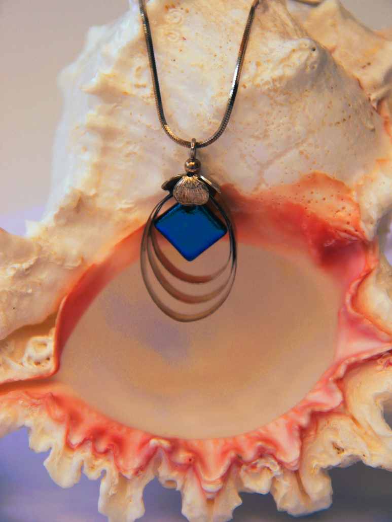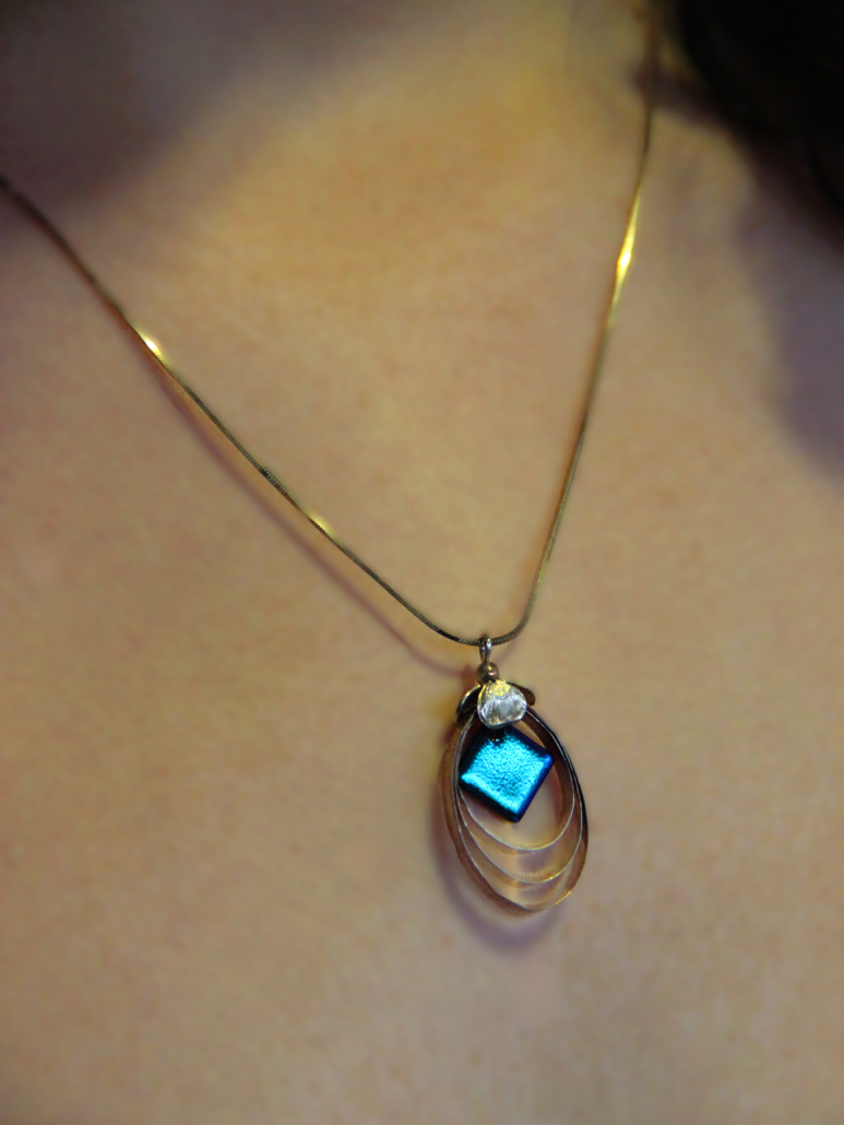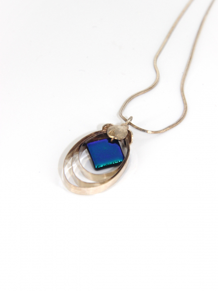 This exquisite handmade necklace features a captivating design, crafted from 925 silver. The focal point of this piece is a stunning fused dichroic glass pendant, displaying a mesmerizing play of colors that shift between deep blue and vibrant green. The pendant is encased in an elegant silver setting, with an intricate, overlapping loop design that adds depth and dimension. The silver chain is sleek and refined, perfectly complementing the pendant’s unique beauty.