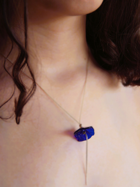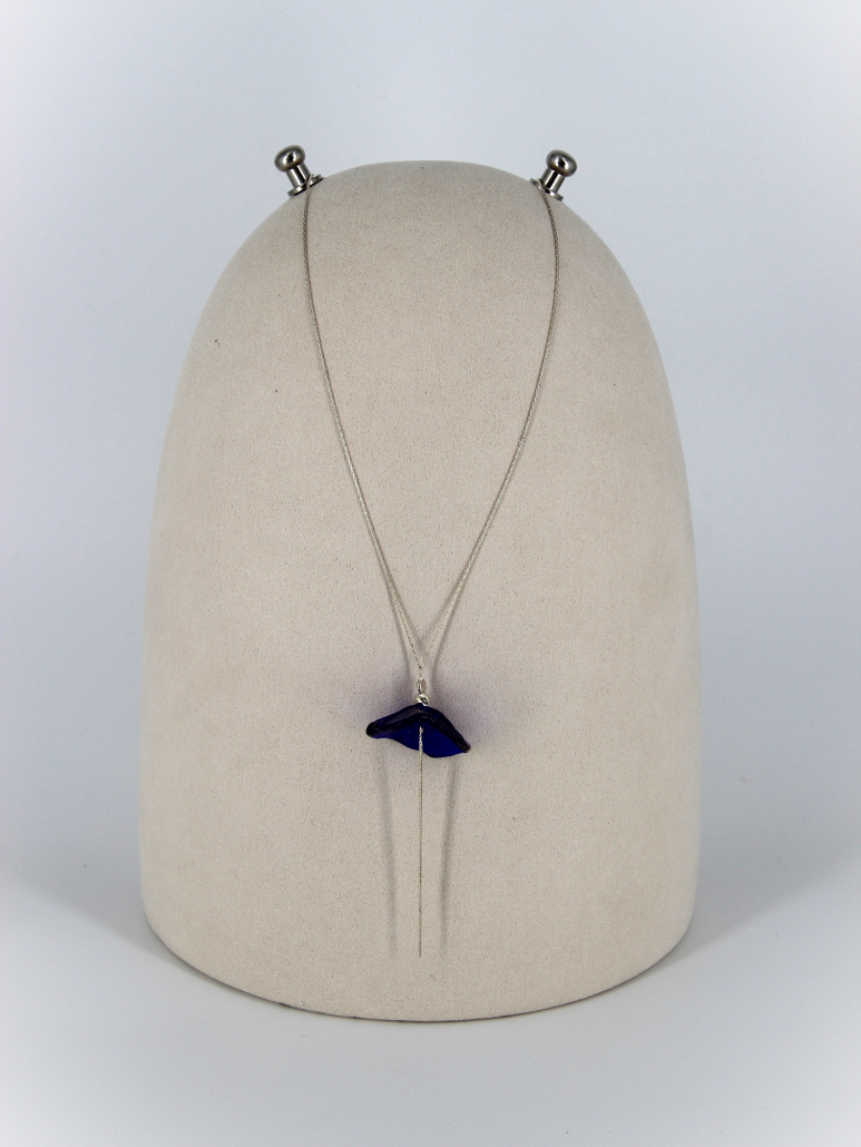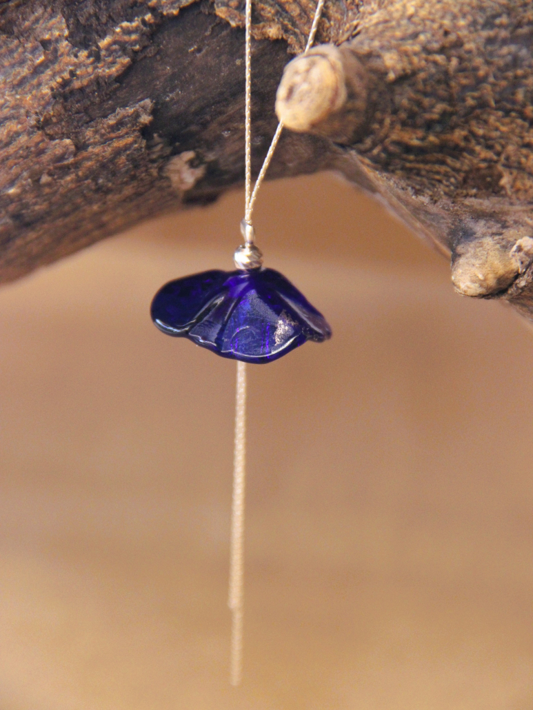 This handmade necklace features a delicate design crafted from 925 silver. The centerpiece is a striking lampwork glass flower bead, which showcases a deep, vivid blue hue with intricate details. The silver chain is fine and elegant, complementing the unique glass bead. The bead’s rich color and artistic design make this piece both eye-catching and sophisticated, perfect for adding a touch of elegance to any outfit.