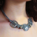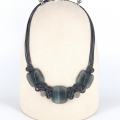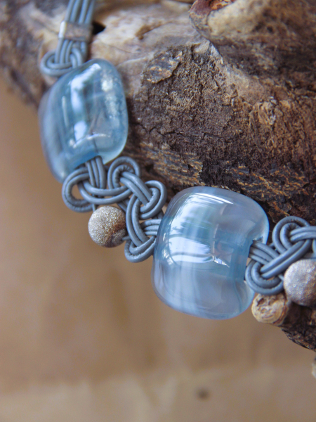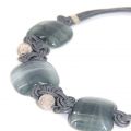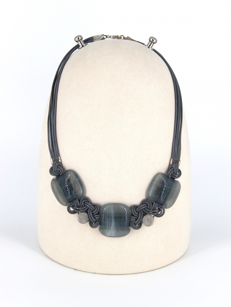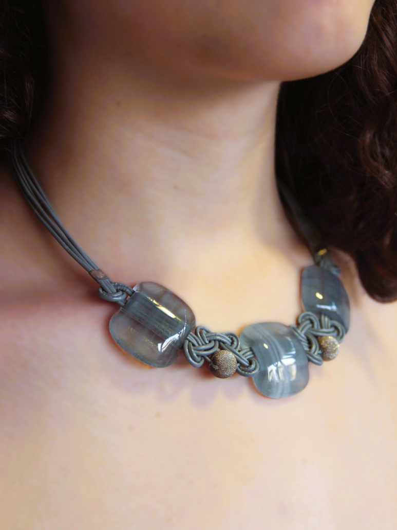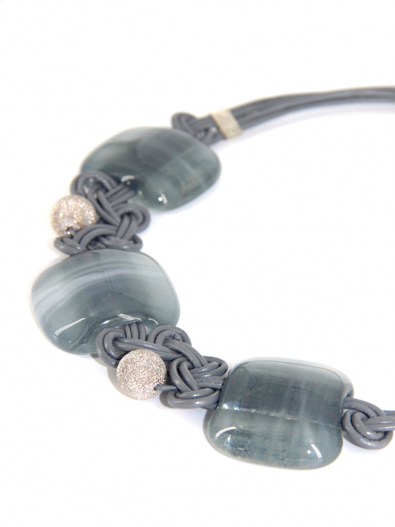 This stunning handmade necklace features a unique combination of leather, 925 silver, and fused glass. Each glass piece is carefully crafted, showcasing intricate designs and vibrant colors. The leather strands are intertwined with the silver elements, creating a harmonious blend of textures and materials. Perfect for adding a touch of elegance and artistic flair to any outfit, this necklace is a testament to exquisite craftsmanship and attention to detail. The versatile design makes it suitable for both casual and formal occasions, ensuring it becomes a cherished addition to your jewelry collection.