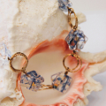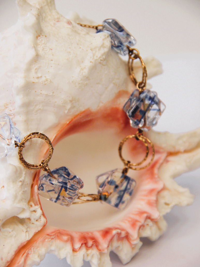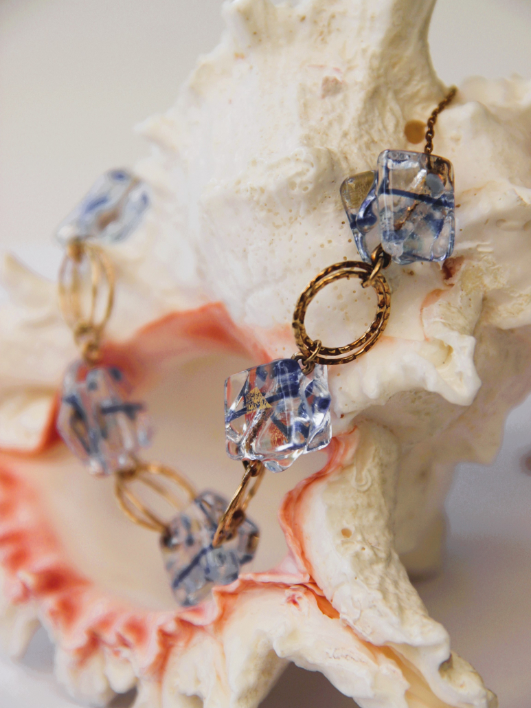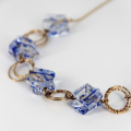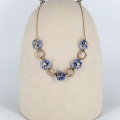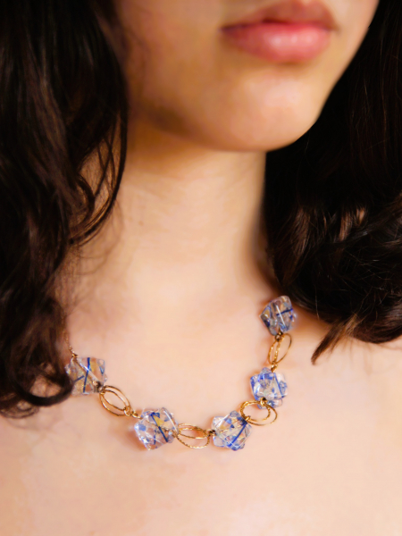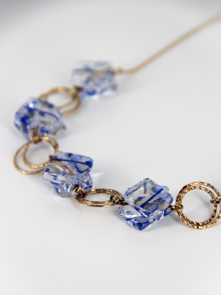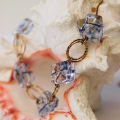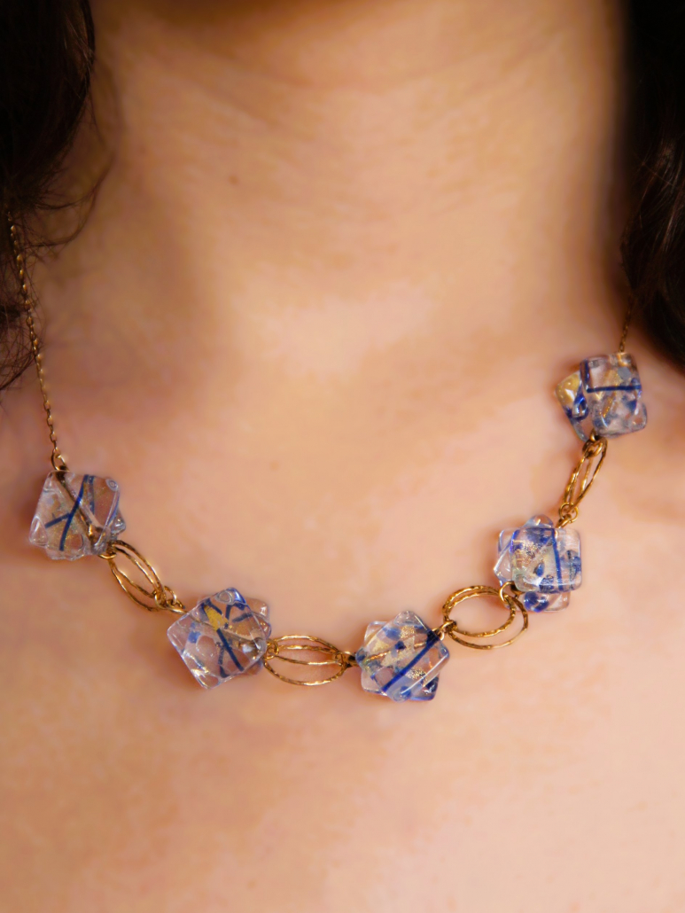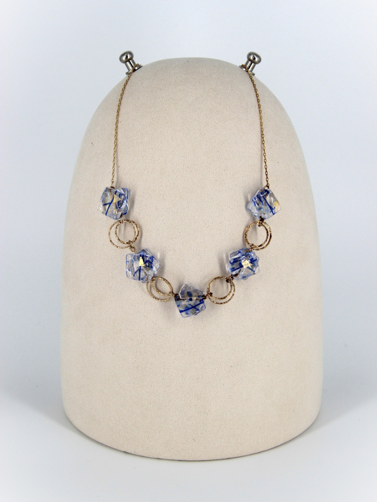This exquisite handmade necklace showcases unique fused glass beads in a striking pattern of blue and white. Each bead captures the essence of ice and sky, intertwined with golden goldfield links that enhance the cool tones with a warm contrast. The structure of the necklace, featuring interlocked circles and glass, lends a sophisticated yet playful element to the design. Perfect for accessorizing a chic outfit, this piece combines artistic flair with a touch of luxury.