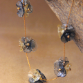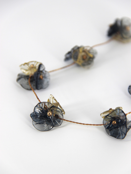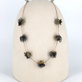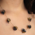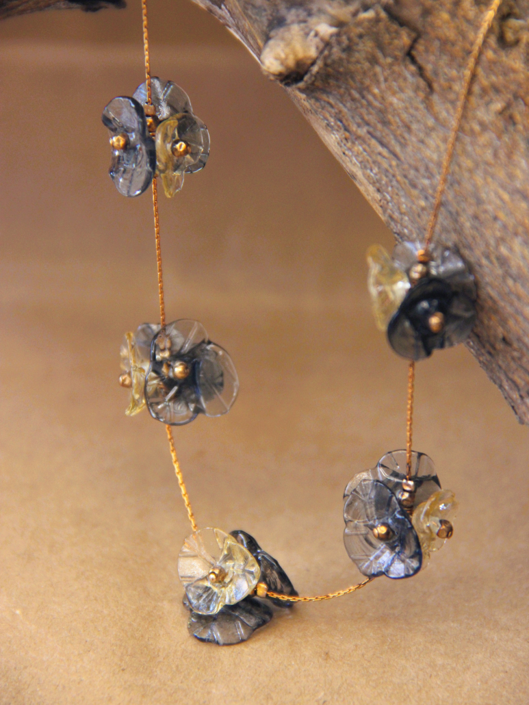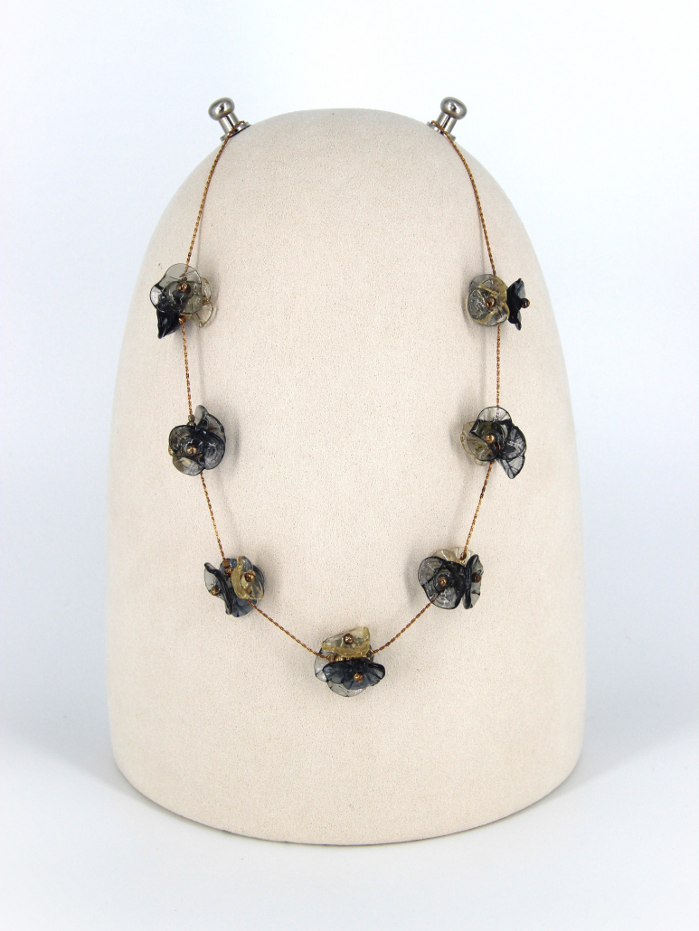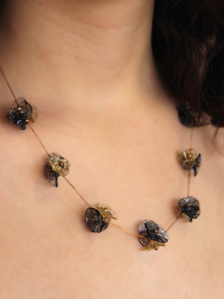 This exquisite handmade necklace features a delicate gold-filled chain adorned with a series of lampwork glass flower beads. Each bead is meticulously crafted through the art of lampwork, showcasing a blend of black and gold hues that add a touch of elegance and sophistication. The arrangement of multiple flower beads along the chain creates a stunning visual effect, making this necklace a perfect accessory for adding a unique and artistic flair to any outfit.