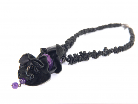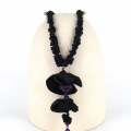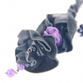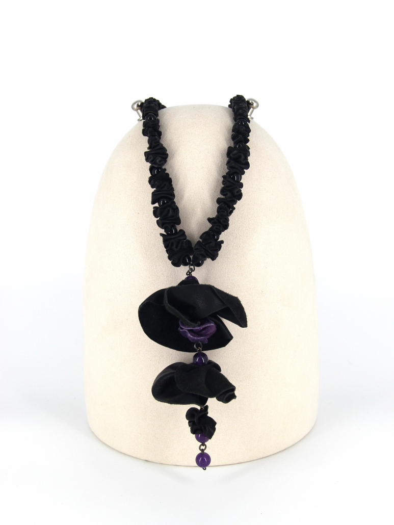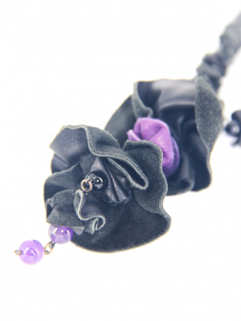 This striking handmade necklace is a unique piece crafted from a combination of leather, 925 silver, and amethyst beads. The necklace features an intriguing design of black leather, artfully fashioned into rose-like clusters that create a dramatic and sophisticated look. Each leather flower is complemented by deep purple amethyst beads, adding a touch of elegance and color contrast. The amethyst beads are interspersed within the leather flowers and dangle gracefully at the pendant’s end, enhancing the necklace’s dynamic and artistic appeal. The necklace is strung on a 925 silver chain, ensuring durability and a luxurious finish. This bold and stylish piece is perfect for making a statement and adding an edgy yet refined touch to any ensemble.