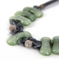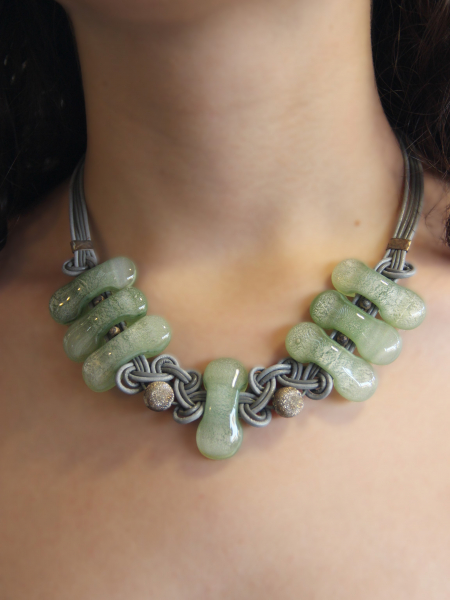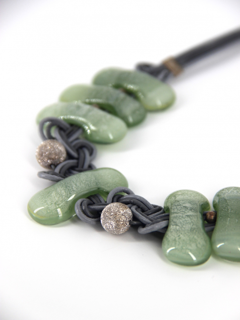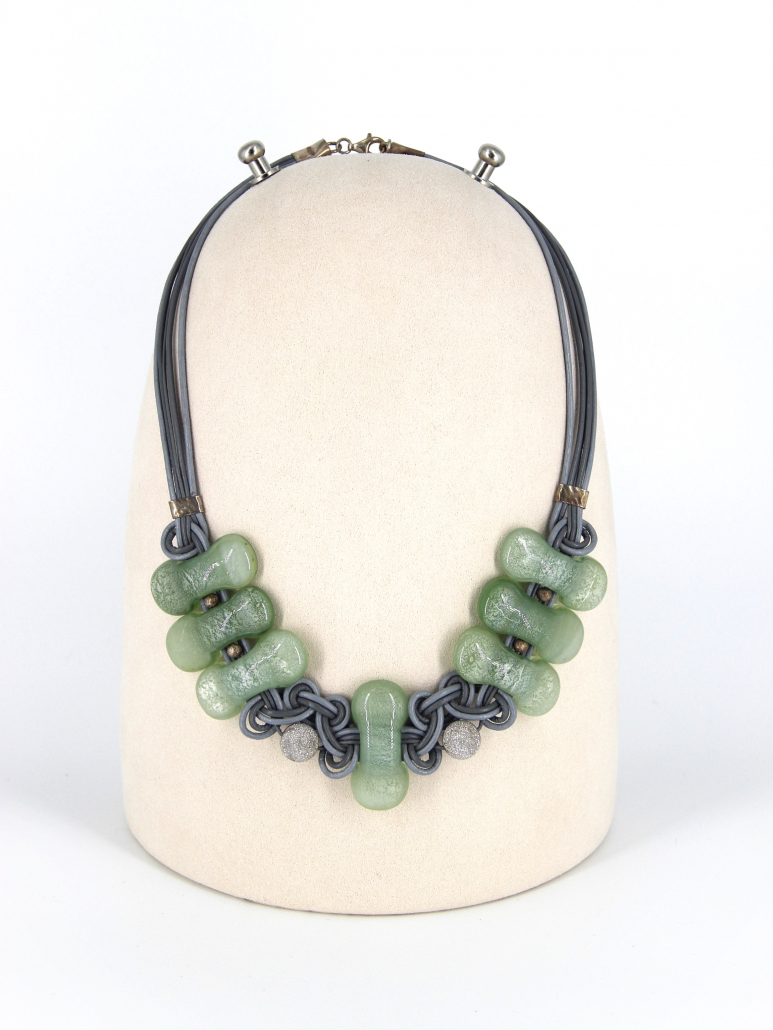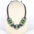 This exquisite handmade necklace features a unique combination of materials. Crafted with durable leather cords and adorned with elegant fused glass beads, it showcases a harmonious blend of colors and textures. The addition of 925 sterling silver and intricate knots enhances its sophisticated appeal, making it a standout piece for any collection. The soothing green tones of the fused glass beads provide a touch of tranquility, while the silver accents add a hint of luxury. Perfect for any occasion, this necklace is both stylish and versatile.