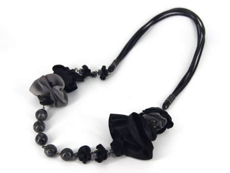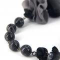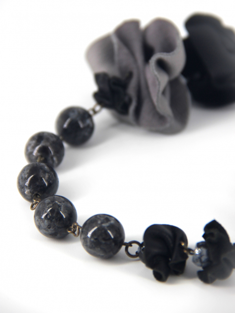 This sophisticated handmade necklace features a striking combination of leather, 925 silver, and labradorite. The necklace is adorned with elegantly crafted leather rosettes in shades of black and grey, creating a dynamic and textured appearance. Interspersed with the leather flowers are polished labradorite beads, known for their mesmerizing play of colors and natural iridescence. The beads are spaced evenly along the necklace, adding a touch of elegance and mystery. The necklace is finished with a durable black leather cord, complemented by 925 silver components for added refinement and durability.