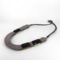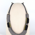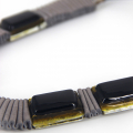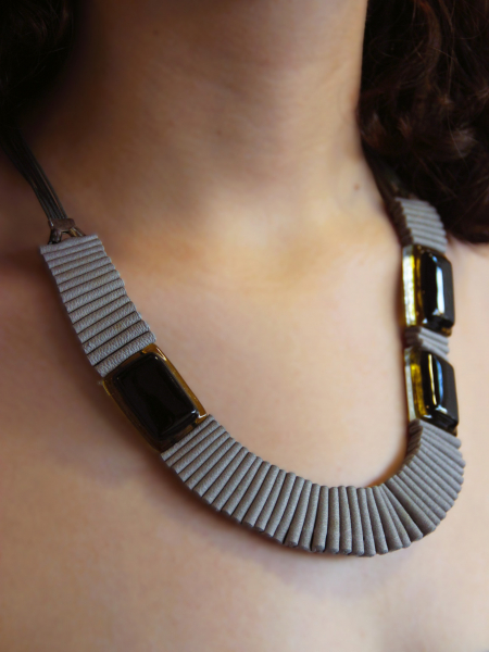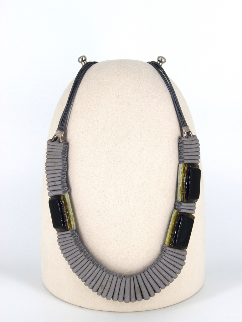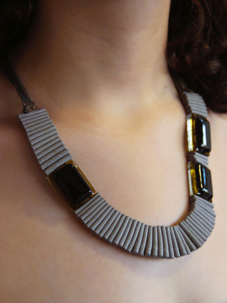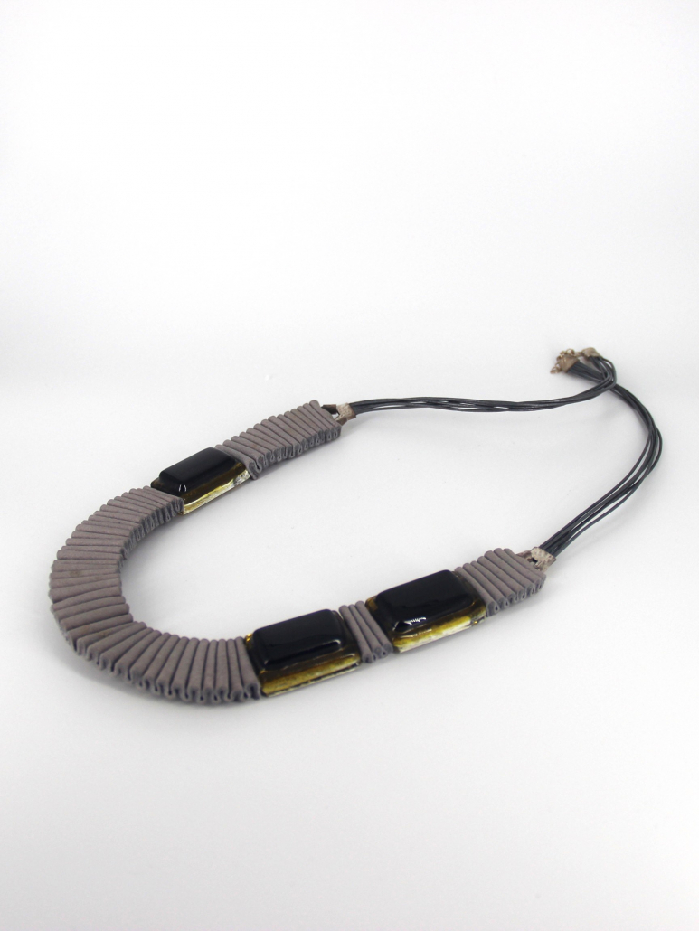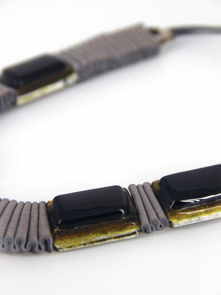 This unique handmade necklace showcases a sophisticated combination of leather, 925 silver, and fused glass. The necklace features a series of large, rectangular fused glass beads in rich black and amber hues, each framed elegantly to highlight their glossy finish and intricate patterns. These stunning glass beads are interspersed with finely pleated grey leather segments, adding texture and a modern touch to the design. The leather segments are meticulously arranged to create a harmonious and balanced look. The necklace is completed with a durable leather cord, secured with 925 silver components, ensuring both comfort and longevity.