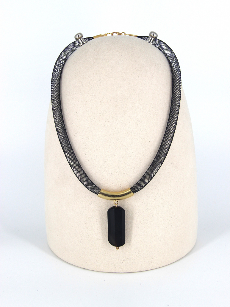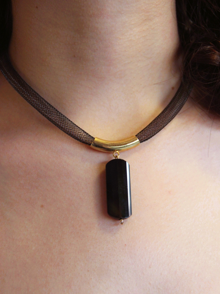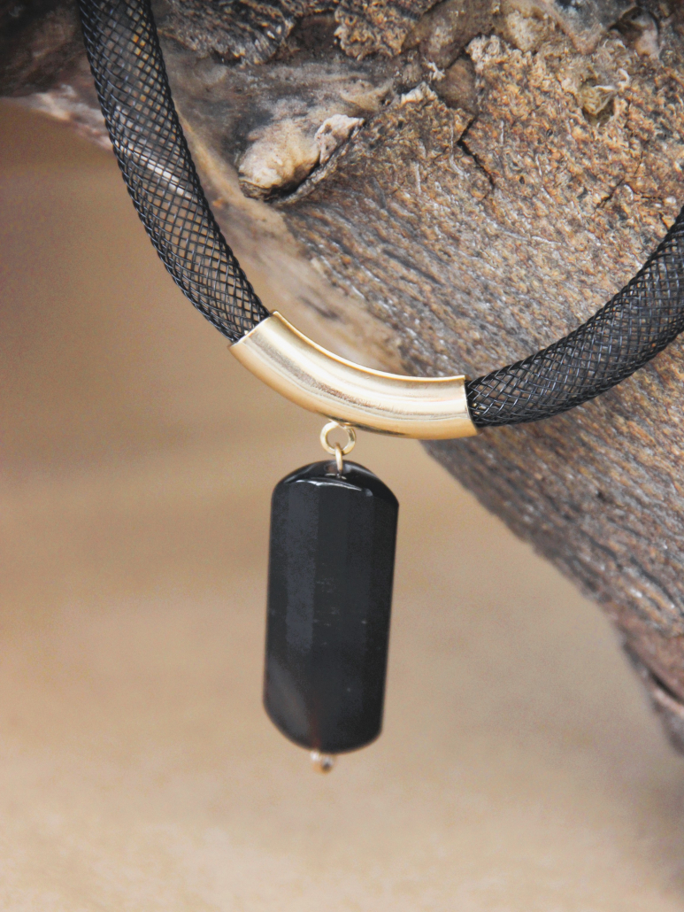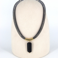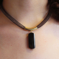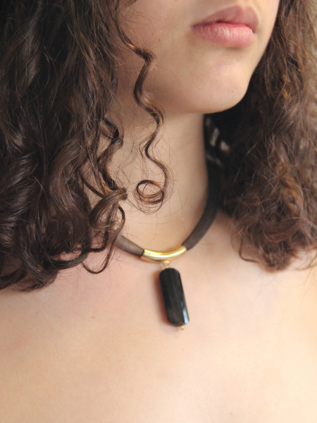 This sophisticated handmade pendant showcases a minimalist and elegant design, crafted from opal stone, gold-filled components, and silicone. The focal point of the necklace is a sleek, elongated black opal stone, which exudes a subtle iridescence and depth. The opal pendant is suspended from a smooth, gold-filled tubular bead, adding a touch of luxury and contrast to the design. The pendant and gold-filled accent are strung on a durable and comfortable brown silicone cord, creating a modern and stylish look. This necklace is perfect for adding a touch of refined elegance to any outfit, making it a versatile and standout piece in any jewelry collection.
