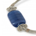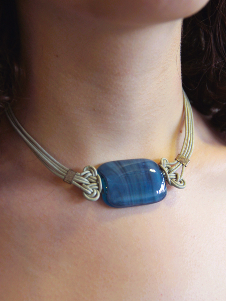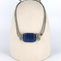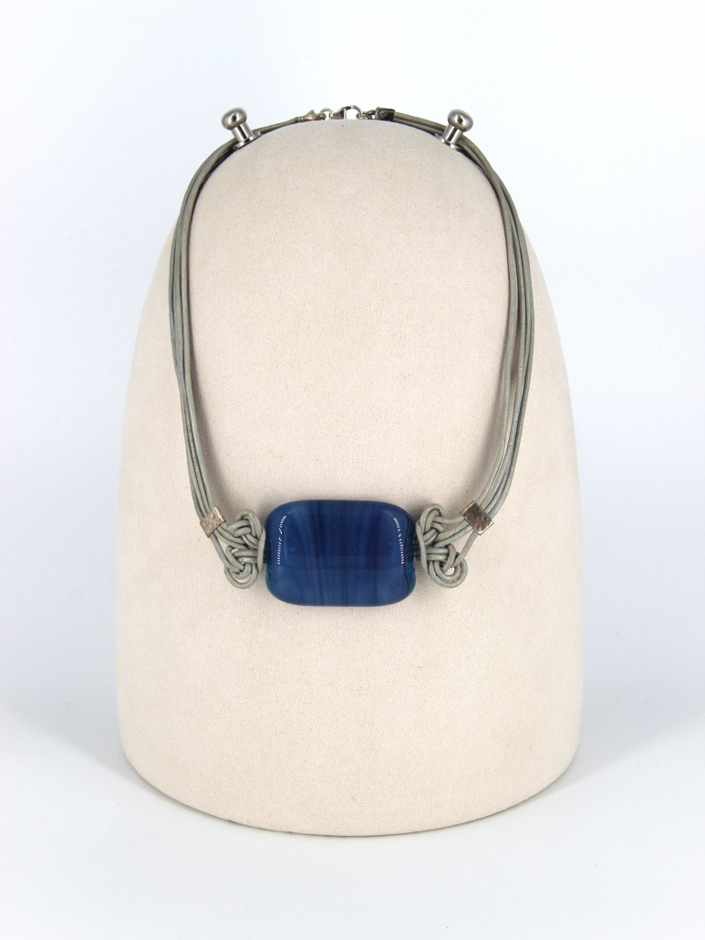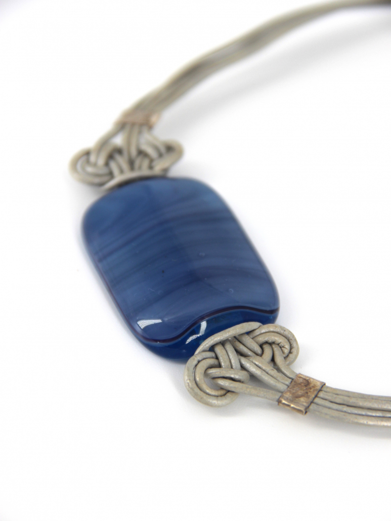 This exquisite handmade necklace showcases a striking fused glass pendant, capturing the essence of the ocean with its deep blue hues. The pendant is elegantly framed by meticulously braided leather cords, adding a touch of rustic charm. Accentuated with 925 silver elements, this necklace combines natural materials with refined craftsmanship, making it a unique and captivating accessory for any occasion. Perfect for those who appreciate the artistry of handmade jewelry and the beauty of natural materials.