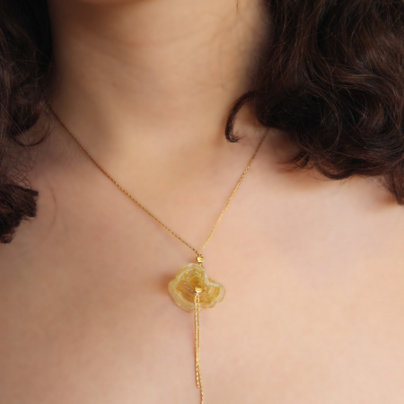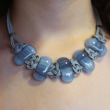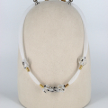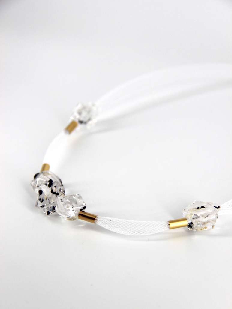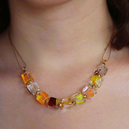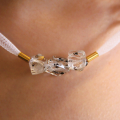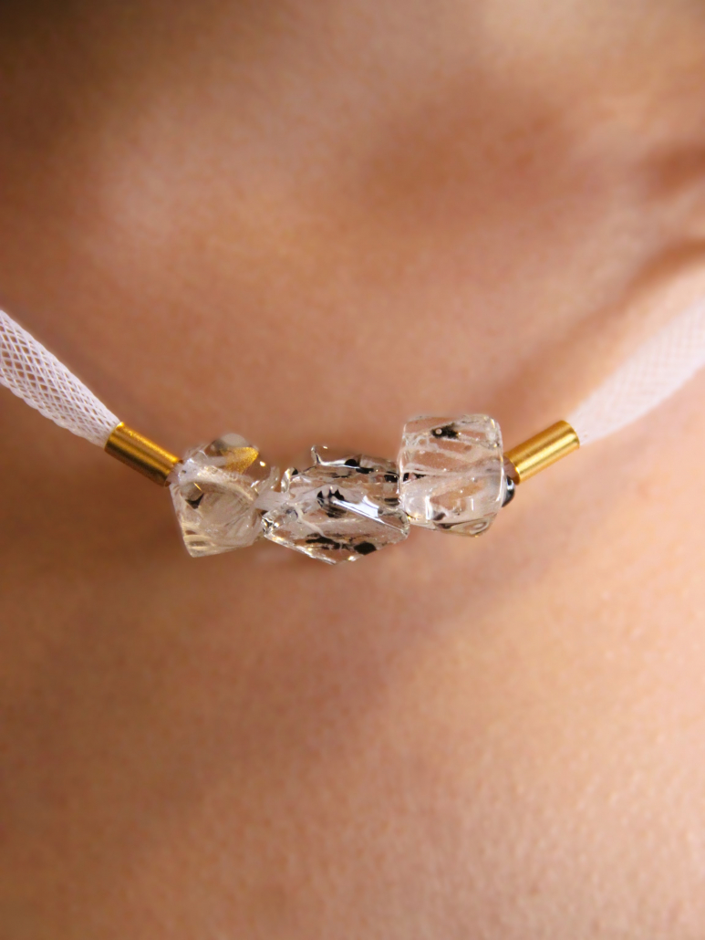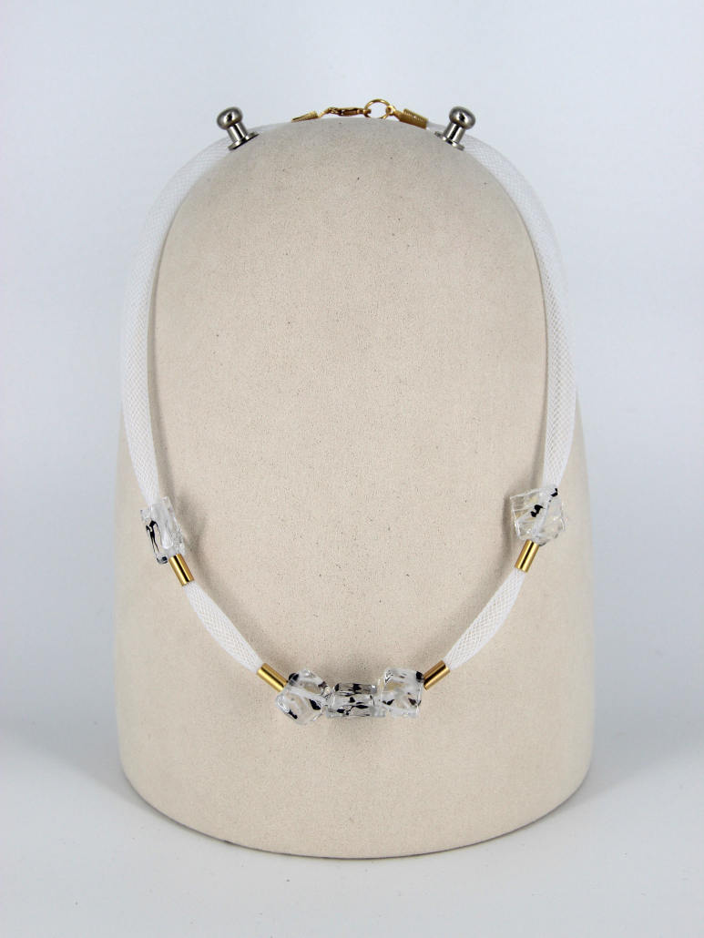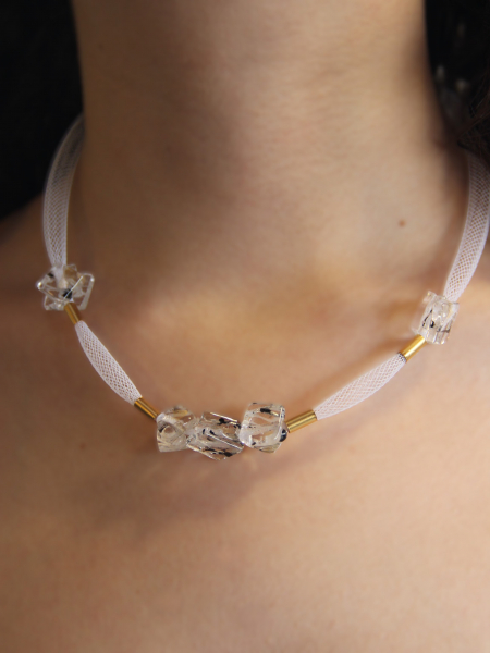 This elegant handmade necklace features a refined combination of fused glass, gold-filled components, and silicone. The necklace is adorned with five clear, cube-shaped fused glass beads, each showcasing a beautifully intricate pattern that captures and reflects light exquisitely. These striking glass beads are interspersed with sleek gold-filled spacers, adding a touch of luxury and sophistication to the design. The beads and spacers are strung on a flexible and comfortable white silicone cord, which is enhanced with a fine mesh overlay for added texture and visual interest. This modern and stylish necklace is perfect for adding a touch of elegance and contemporary flair to any outfit, making it a standout addition to any jewelry collection.
