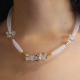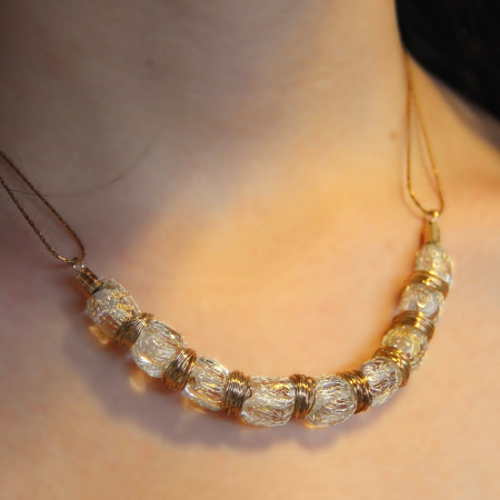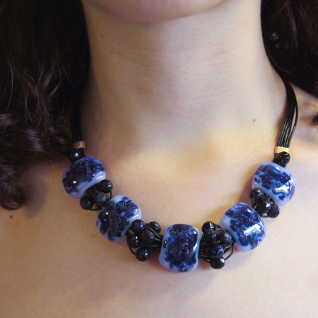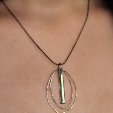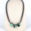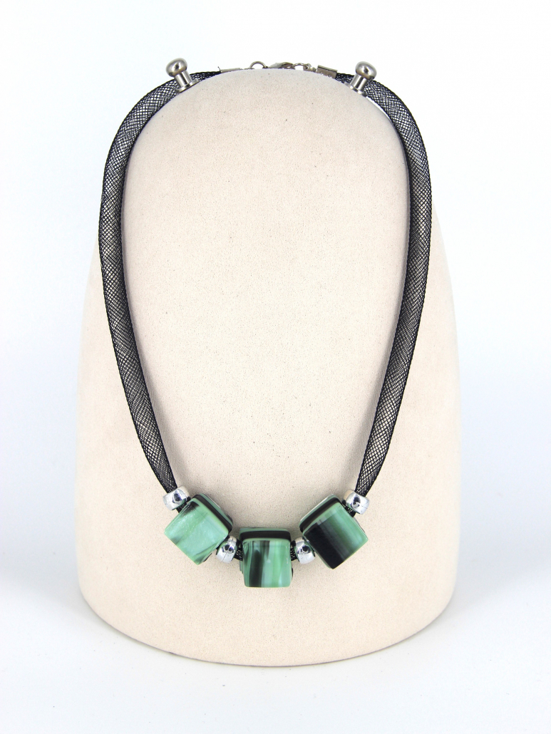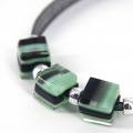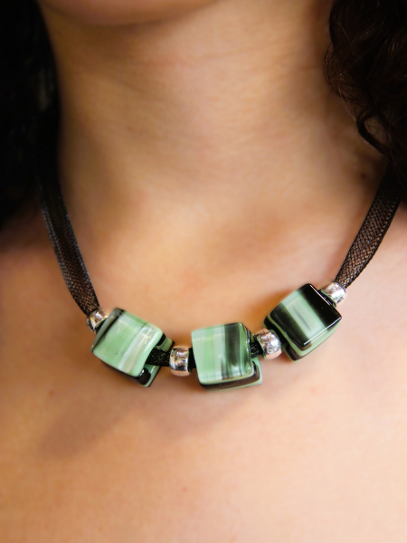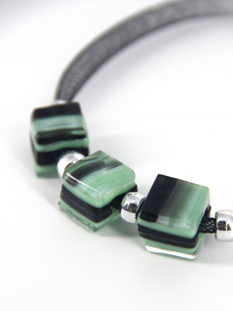 This exquisite handmade necklace showcases a beautiful blend of fused glass, silver, and silicone. The necklace features three square-shaped fused glass beads, each displaying a mesmerizing mix of light green and black hues with a glossy finish. These striking beads are interspersed with polished silver spacers, adding a touch of elegance and contrast to the design. The beads are strung on a durable black silicone cord, which is both flexible and comfortable, ensuring a perfect fit. The combination of materials gives this necklace a modern and sophisticated look, making it an ideal accessory for adding a touch of contemporary flair to any outfit. This piece is a standout addition to any jewelry collection, perfect for those who appreciate unique and artistic designs.