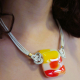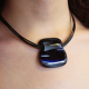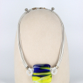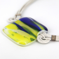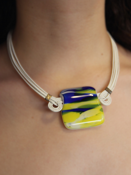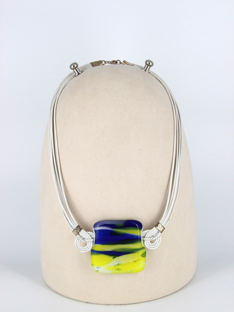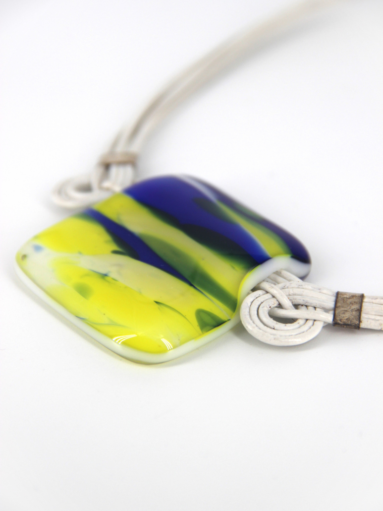 This striking pendant showcases a large, rectangular piece of fused glass with a vivid abstract design in shades of blue, green, and yellow, evoking a sense of energetic movement and boldness. The glass is expertly crafted to create smooth yet dynamic swirls of color. It hangs elegantly from a necklace of multiple fine leather cords, giving it a contemporary and sophisticated look. The cords are neatly secured with polished 925 silver endings, adding a touch of refinement and ensuring the pendant sits comfortably around the neck. This handmade piece combines modern aesthetics with traditional craftsmanship, making it a distinctive accessory for any collection.