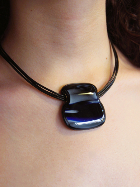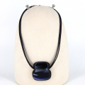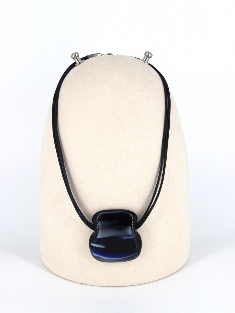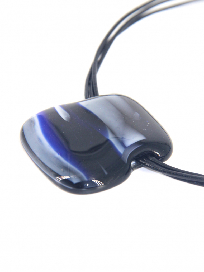 This elegant handmade pendant features a sophisticated design crafted from leather, 925 silver, and fused glass. The centerpiece is a beautifully formed fused glass pendant, showcasing deep, glossy black hues with subtle hints of blue that add depth and intrigue. The pendant’s sleek and polished surface reflects light exquisitely, creating a striking visual effect. It is suspended on a multi-strand black leather cord, which enhances its modern and stylish appeal. The necklace is finished with a 925 silver clasp, ensuring durability and a secure fit. This piece is perfect for adding a touch of contemporary elegance to any outfit, making it a standout addition to your jewelry collection.