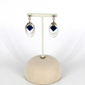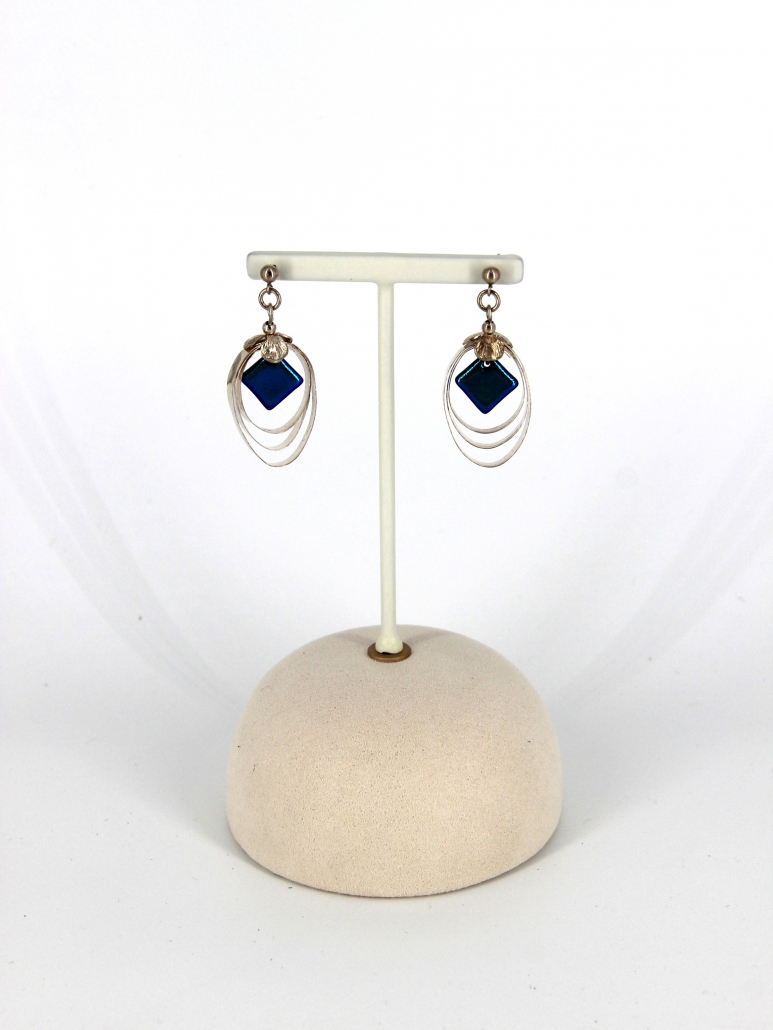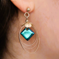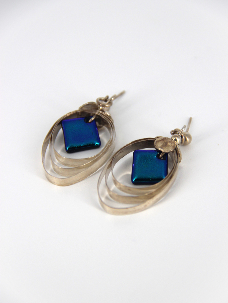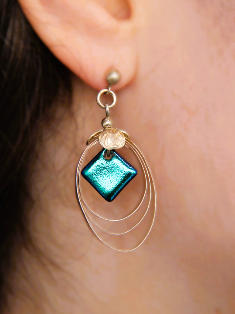 These exquisite handmade earrings showcase a stunning combination of 925 silver and dichroic fused glass. Each earring features a captivating square of dichroic glass, shimmering with vibrant hues of blue and green that change with the light, adding a mesmerizing touch to any outfit. The glass squares are elegantly framed by interlocking loops of 925 silver, creating a dynamic and sophisticated design. The earrings are finished with secure silver stud posts, ensuring comfort and durability. Perfect for adding a touch of color and elegance to your look, these earrings are a unique and beautiful addition to any jewelry collection.