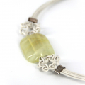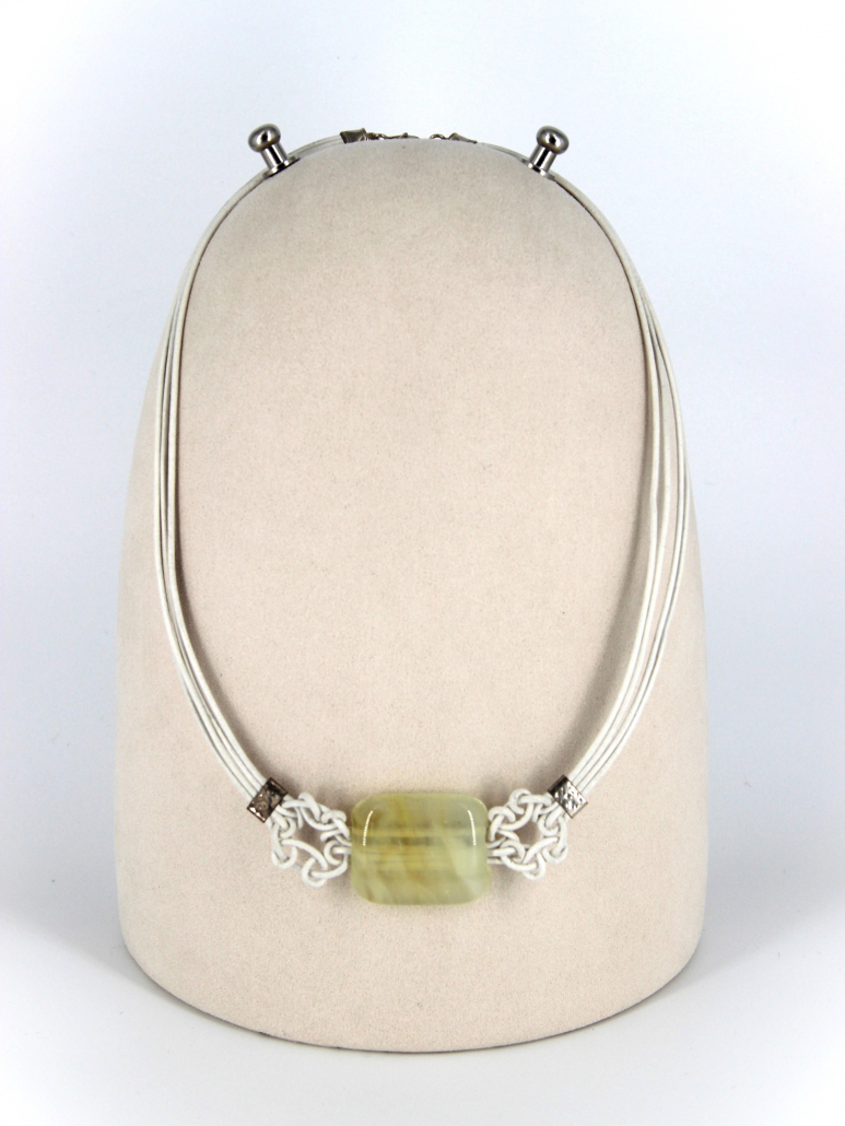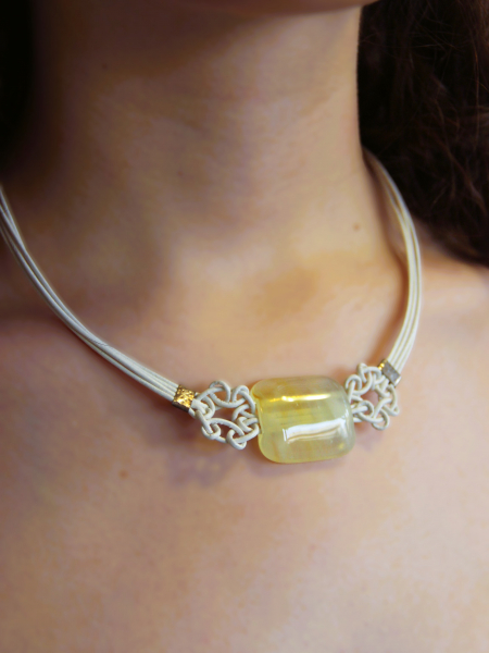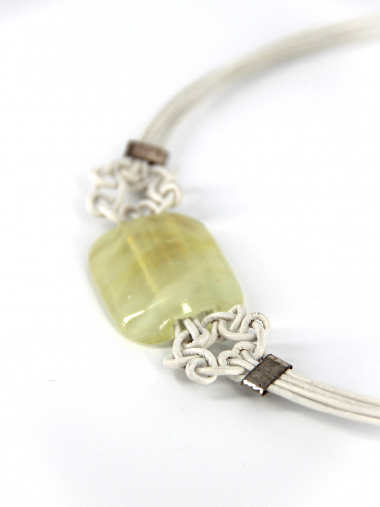 This exquisite handmade necklace features a captivating blend of materials that exude elegance and sophistication. The necklace is crafted with supple leather cords, providing both durability and a comfortable fit. The central piece is a stunning fused glass bead, showcasing a beautiful play of light and color that catches the eye. Accentuating this focal point, the necklace incorporates gold-filled elements, adding a touch of luxury and refinement. This versatile accessory can seamlessly complement both casual and formal outfits, making it a perfect addition to any jewelry collection.