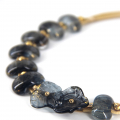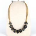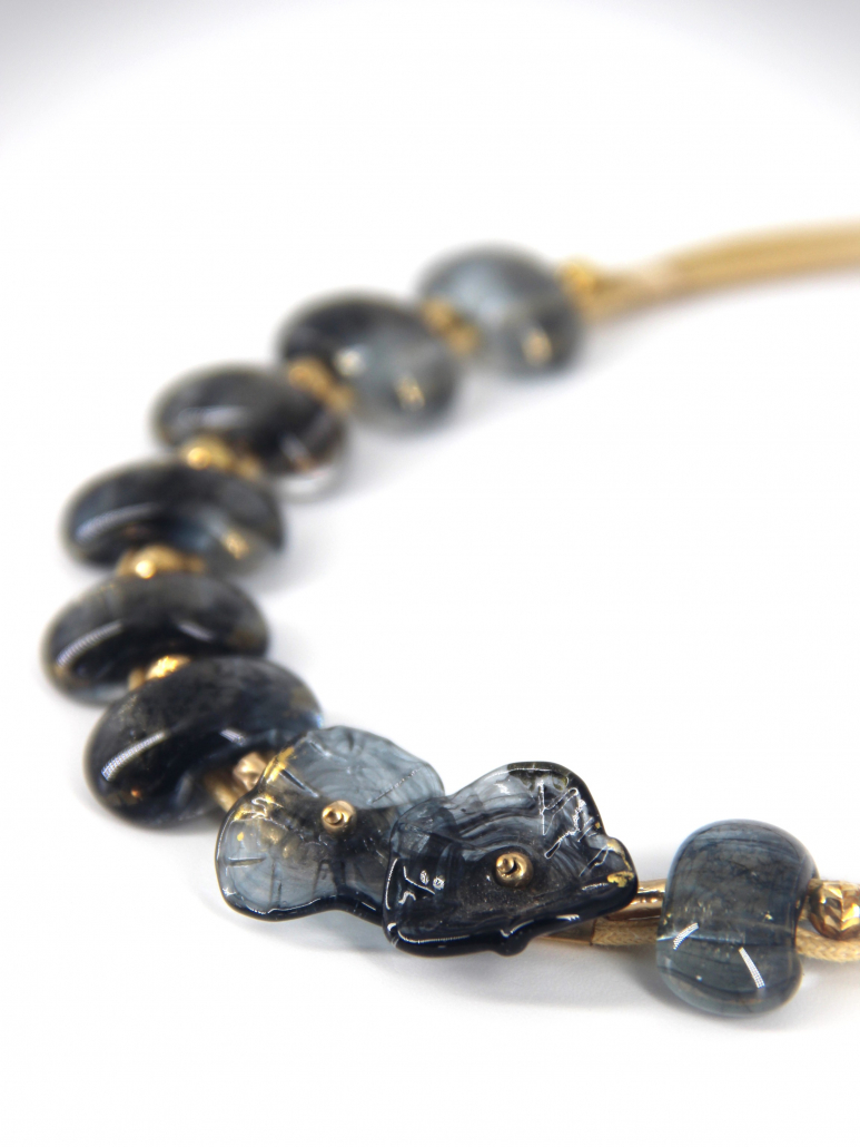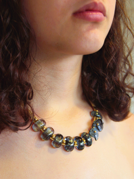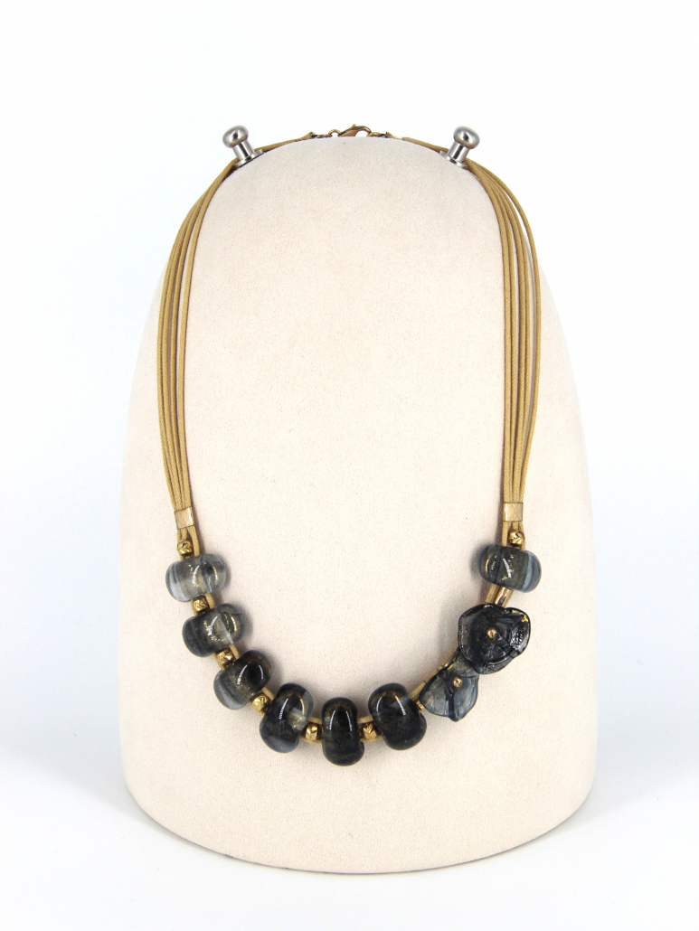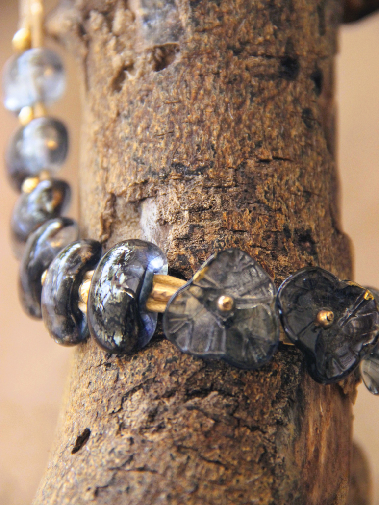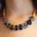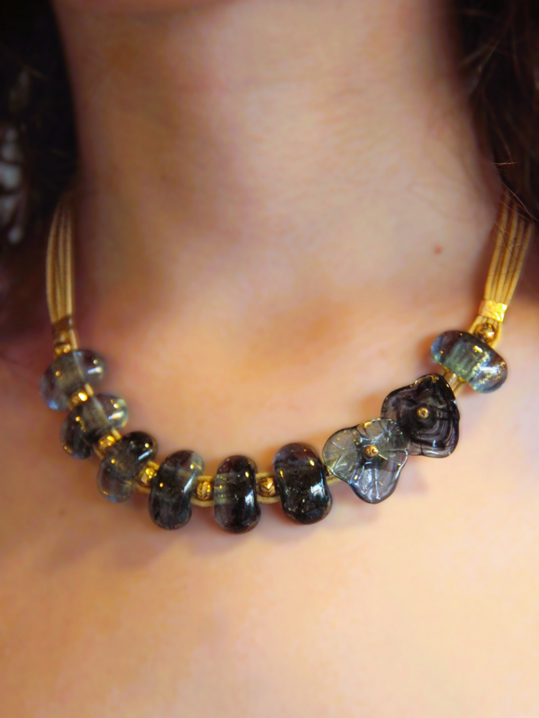 This elegant handmade necklace features a harmonious blend of materials, creating a striking accessory. The necklace is crafted with soft cotton cords, ensuring a comfortable fit. The gold-filled accents add a touch of luxury and sophistication, perfectly complementing the beautiful fused glass beads that exhibit a stunning interplay of colors. Adding a unique charm, the lampwork glass flower beads are meticulously crafted, enhancing the necklace’s overall allure. This piece is versatile and can be worn to elevate both casual and formal outfits, making it a must-have addition to any jewelry collection.